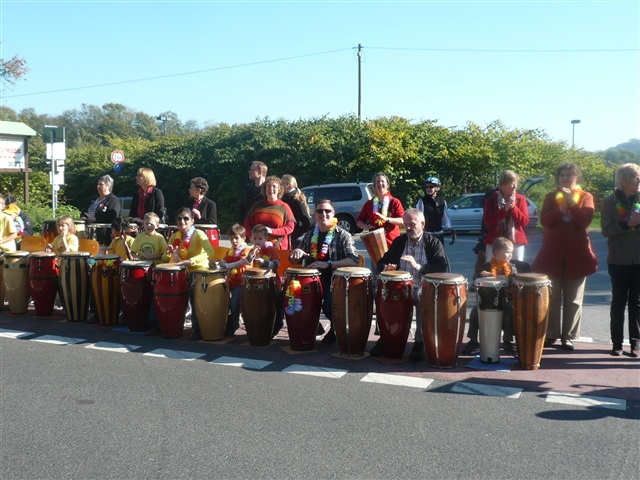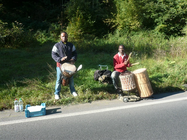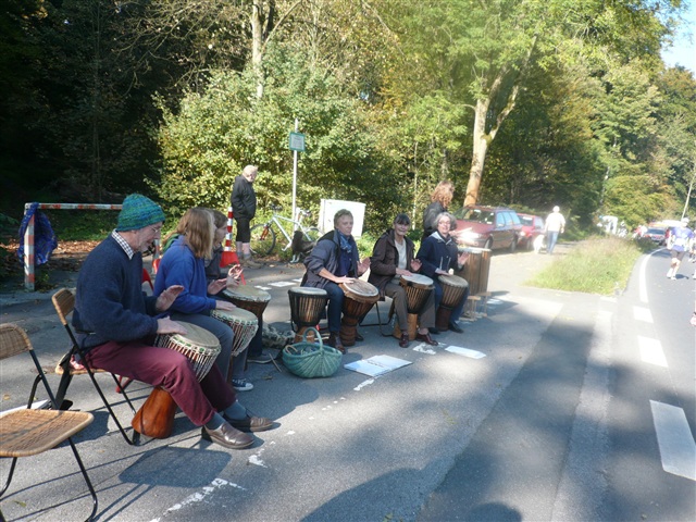 Dann überqueren wir die Ruhr auf der wegen ihres schlechten Zustands nur einseitig befahrbaren Kampmann-Brücke schließlich aber doch noch. Bevor wir wieder der „Banane“ folgen gilt es, zwischen km 12 und 18 eine 3 km lange Begegnungsstrecke auf der gesperrten B 227 nach Norden und zurück zum See zu absolvieren; hier werden die zu 42,195 km fehlenden km der zwei Seeumrundungen gemacht. Auf der zweiten Runde entfällt dann die Begegnungsstrecke, die uns mit Sonne, der dritten Verpflegungsstelle und Trommlern als akustische Erfrischung verwöhnt. Diese Zusatzkilometer wurden in früheren Jahren wohl am Anfang entlang des Seeufers gelaufen, wie mir Jochen erzählt, daher kommt auch der Ruf der Strecke als superflach. Hier müssen aber doch einige Höhenmeter genommen werden, die einem Bergerprobten natürlich nur ein müdes Lächeln abgewinnen, einem Flachlandtiroler jedoch schon auffallen.