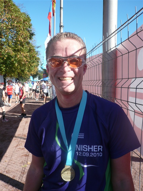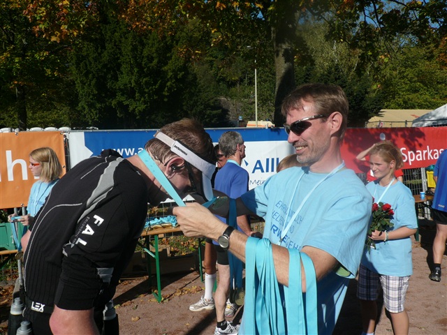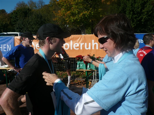 Wir finden ein tolles Plätzchen kurz hinter dem Zieleinlauf und wo die Medaillen (sehr schön!) auf dem Bierzelttisch abgeräumt und verteilt sind, findet der Hintern des Herrn Bernath ein Plätzchen, wo er, von der Sonne bestrahlt und Erdinger trinkend, wieder Energie tanken kann. Viele nette Gespräche möbeln mich mental auf, Jochen versorgt Werner und mich mit einem weiteren Bleifreien und die Welt ist wieder schön. Die Rückfahrt im offenen Roadster tut ein Übriges.