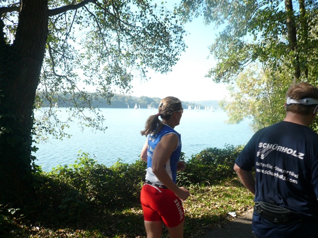 Toll ist der Blick auf den sonnenbestrahlten See, auf dem sich inzwischen viele Segelboote tummeln. Immer wieder stehen Fangruppen an den Seiten und beklatschen uns unermüdlich. Gefühlt ist es zwar keine große Anzahl, aber deren Ausdauer ist schon beachtlich, und das auch noch, nachdem bereits über die Hälfte des Feldes durch ist. Bei etwa km 22 wechseln die Staffeln auf den dritten Läufer und schon nähern wir uns wieder dem Startgelände, wo bei km 23,5 die zweite Runde beginnt und die fünfte Trankstelle bei km 25 durstige Kehlen erquickt.