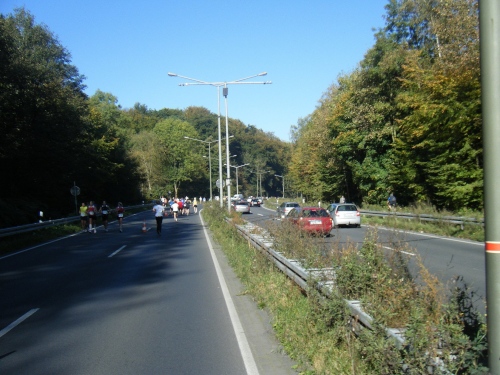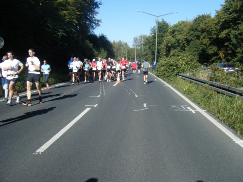 Nun gilt es, die anstehende Wendepunktstrecke zu meistern. War ich früher ein absoluter Gegner dieser Art von Streckenführung, so weiß ich heute deren Vorteil zu schätzen. Ständig gibt es bei den entgegenkommenden Läufern Neues zu entdecken. Etwas pittoresk ist das schon. Links kommen einem die Läufer entgegen, rechts läuft mal selbst und jenseits der Leitplanke braust der Verkehr zweispurig in Richtung Innenstadt.