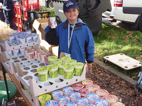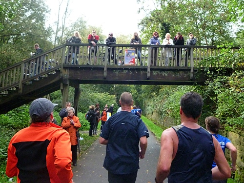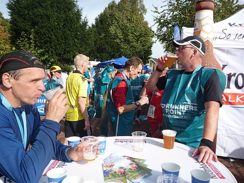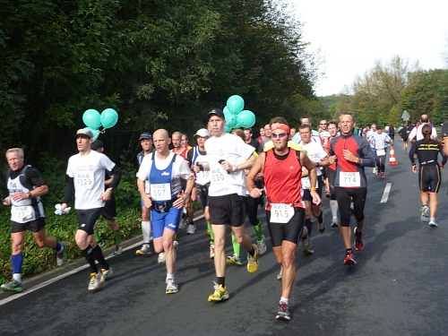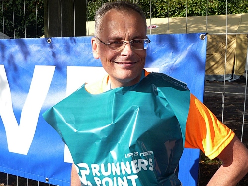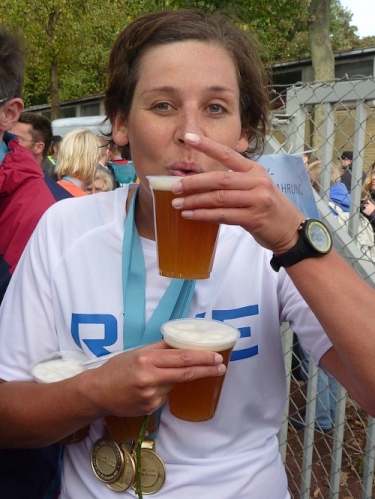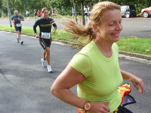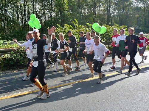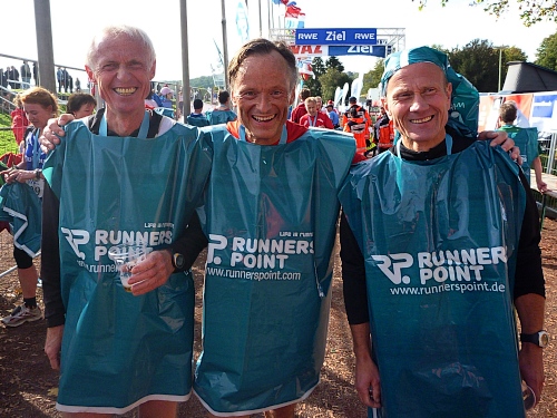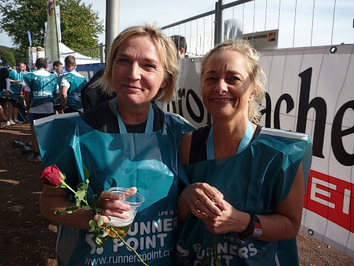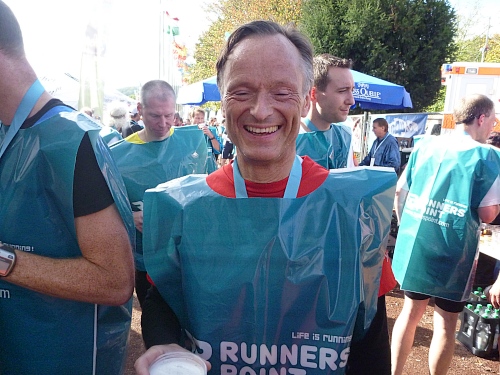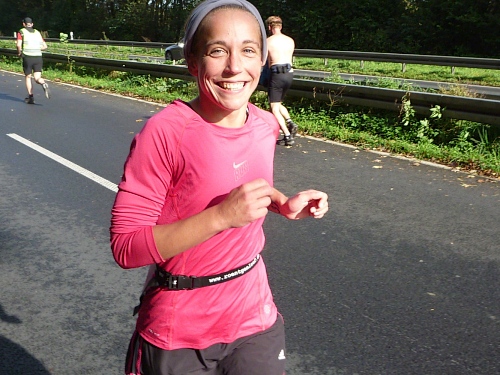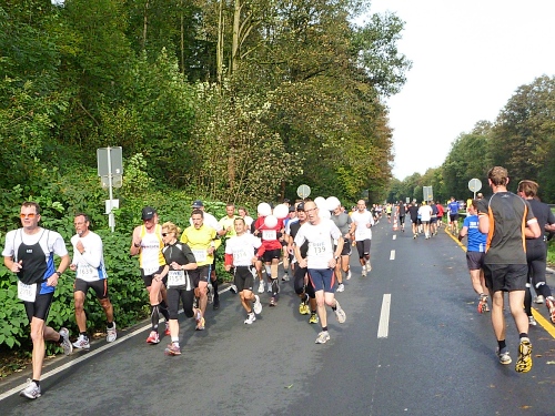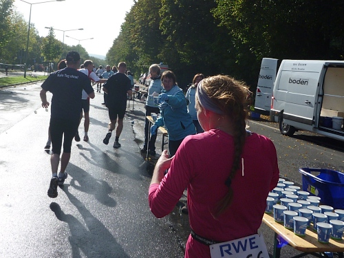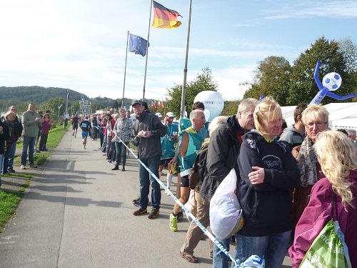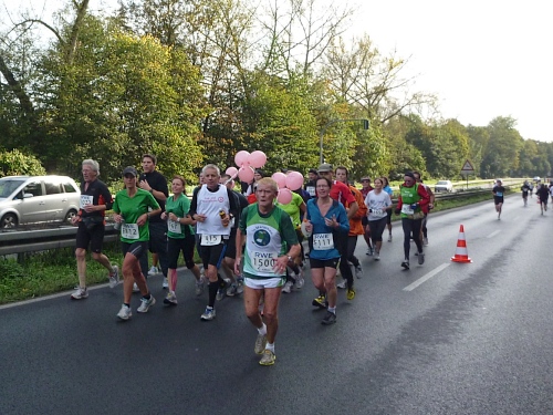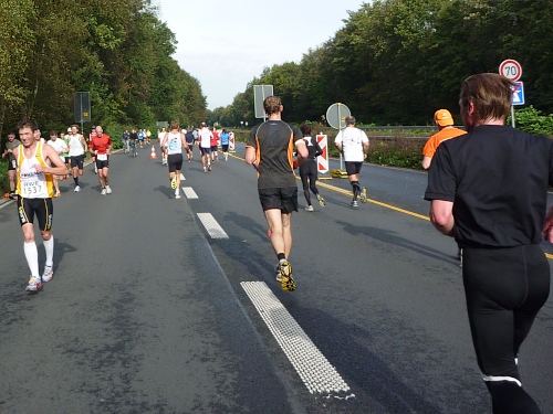 Falls ich etwas trinken muss, gibt es kein Gedränge an den Verpflegungspunkten. Die Helfer reichen Getränke und Bananen weit in das dünne Läuferfeld hinein, sodass ich nicht stoppen muss. Es ist ein herrlicher Lauf, frei und ohne Ablenkung, die wenigen Spaziergänger stören nicht. Ich hänge mich gerne an die schnellen Staffelläufer, konzentriere mich auf den langen Geraden auf korrekte Laufhaltung, die Ellenbogen schwingen spitz nach hinten und geben mir Schwung. So denke ich wenigstens. Doch jeder erkennt mich an meinem eigenartigen Laufstil. Egal, ich freue mich über Sport pur.