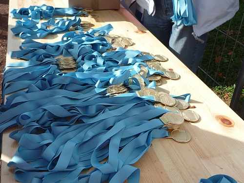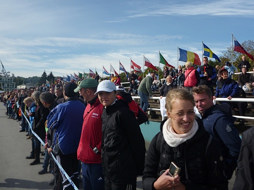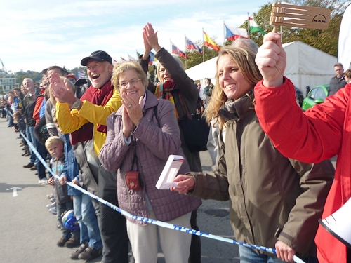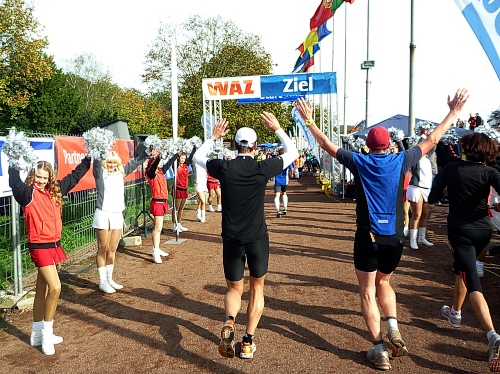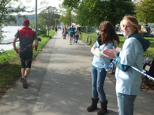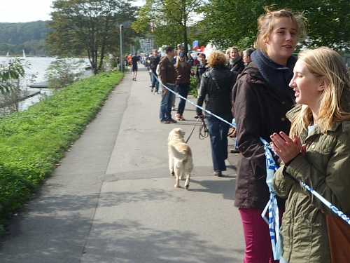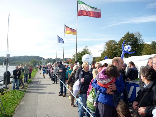 Und dann bist du am Seeufer, blutjunge Sportlerinnen halten dir die Zuschauer mit Flatterband vom Hals. Ich versuche Fotos von den Nachwuchssportlerinnen zu schießen, denn das Auge läuft ja mit und der Leser will informiert sein. Doch zu schnell wird mein Lauf in der Masse der Zuschauer. Brechend voll ist die Tribüne, auf der sonst die Regatta begutachtet wird. Es wird gebrüllt und geschrien. Dann die Wende hinten am Regattaturm. Mir hängt die Zunge aus meinem trockenen Mund. Schnell, schnell. Die Pompöms, der Hüpfmädchen glitzern mir schon entgegen. Da sind doch zwei Staffelläufer vor mir, reißen die Arme nach oben und verbauen mir meinen Endspurt. Ich also cool in die Hocke, was nicht schmerzfrei ist und wetze unter den deofreien Armen hindurch. Was für ein Zieleinlauf, endlich wieder Runners high!