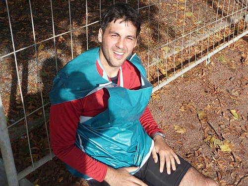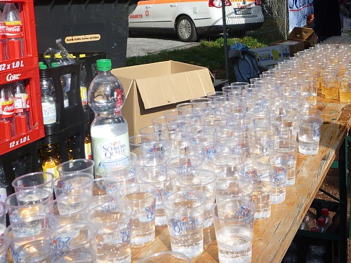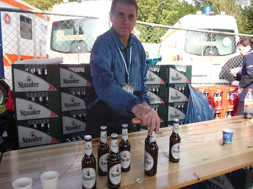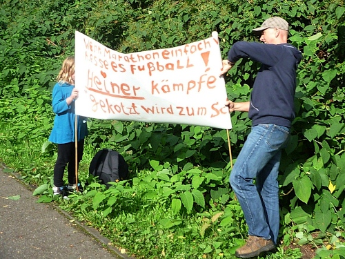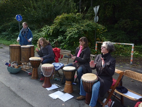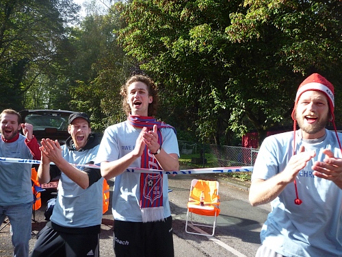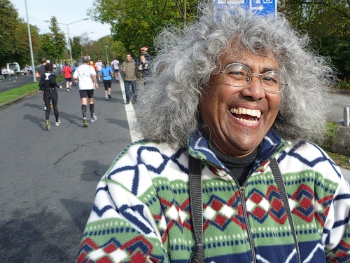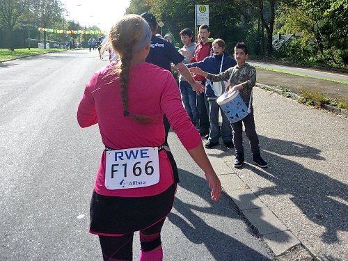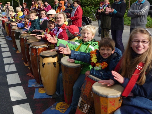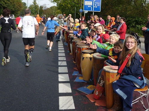 Es ist sowieso heiß hier auf der Strecke, denn wie jedes Jahr steht hier der Grauhaarige aus ferner Urlaubsgegend mit seinen Trommlern und heizt uns ein. Sein breites, sympathisches Lachen ist jedes Mal der Hit, die Kinder hauen mit voller Begeisterung auf die Tierhäute, als wäre es die letzte Gelegenheit für sie, sich zu outen.