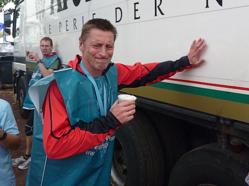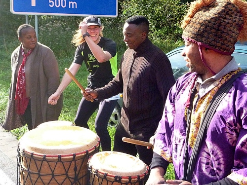 Auf der anderen Seite ein baufälliges Auto, davor die Trommler aus Tief-Afrika, auch sie gehören zu diesem Marathon wie der See. Peer legt spontan eine Tanzeinlage ein, er begleitet heute Esther auf ihrem ersten Marathon.