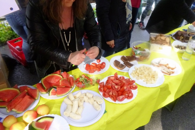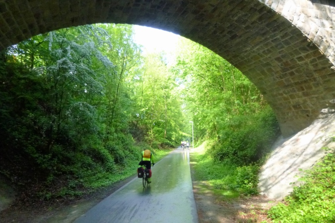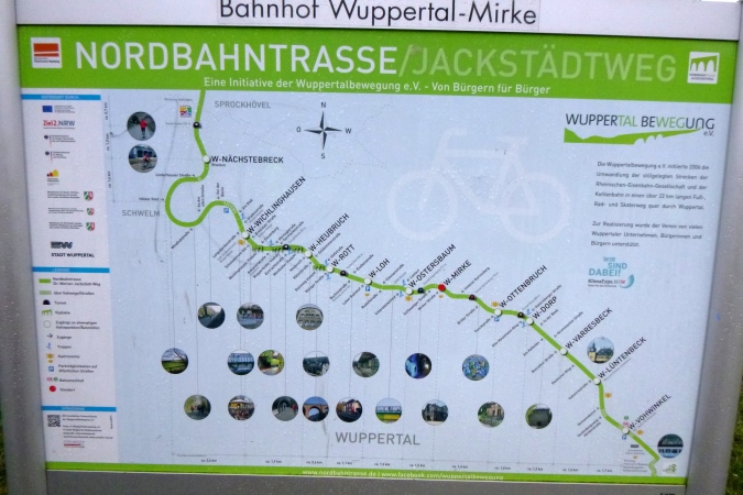 Nordbahntrasse, Wuppertal. Die Gleise fehlen, perfekter Asphalt liegt auf dem Schotter. Der Bahnhof Mirke bildet den Startpunkt. Das Gelände der Utopiastadt dient als großer Stützpunkt: leckeres Frühstück im (offenen) Zelt bis zum Abwinken. Lausig kalt ist es. Die Grade sind einstellig. Aber es gibt keinen Regen mehr, der fiel in der Nacht. Mit dem Plastikmesser steinharte Nutella aus dem Glas kratzen, das ist die erste Herausforderung. Wurst und Käse sind da schon einfachere Alternativen. Aber Hauptsache Kaffee. Es gibt auch noch ein geschlossenes Zelt mit Heizpilzen drin. Da kann man den Kaffee trinken, ohne ihn durch Schüttelfrost zu verschütten.