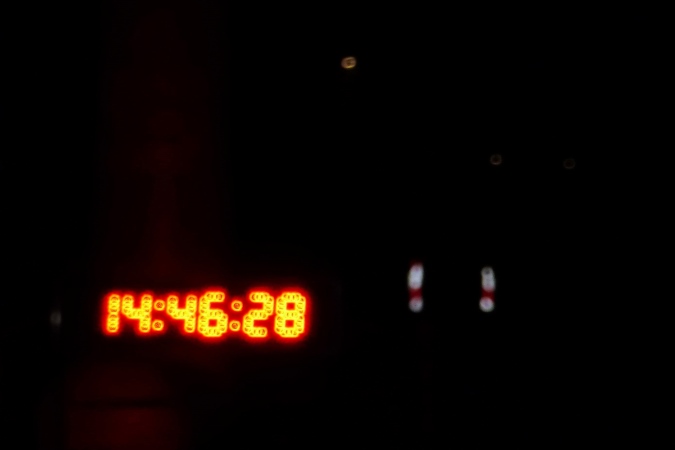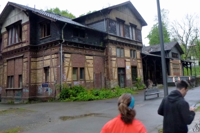 An einem alten Bahnsteig gibt es eine noch funktionierende Uhr. Was die anzeigt, beruhigt mich wieder. Außerdem sind die letzten km einzeln beflaggt. Nur, dunkelgraue Wimpel im Halbdunkel muss man erstmal erkennen. Egal, plötzlich- oder endlich- kommt der Wendepunkt vom Start, dann das blaugelbe Zirkuszelt und der langersehnte Zielbogen. 14:46. Just in time. Chef an alle: Ihr könnt aufhören, nur noch bis zum Auto.