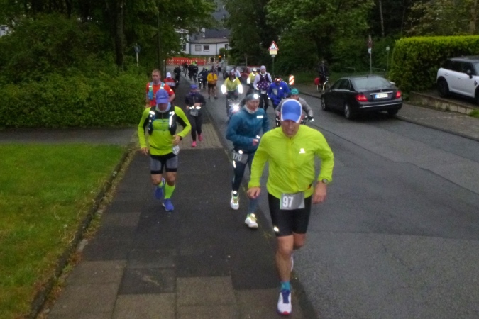 Wildes Gewusel am Start. Viele Teams mit Rädern sind dabei, manche eskortieren, manche wechseln unterwegs. Die Radler haben‘s echt schwer, sie werden kaum warm heute. Langsames Fahren macht eben nicht richtig warm. Noch sind alle außer Rand und Band. Fröhliches Schnattern ringsumher, viele der üblichen Verdächtigen sowieso, die Ultrafamilie ist wieder versammelt. Plötzlich streben alle zum Startbogen, ein Bürgermeister spricht zu uns, angezählt wird – und ab in die verkehrte Richtung. Eine kurze Schleife zum Anwärmen, anschließend kann man schon mal den Zieleinlauf proben…
