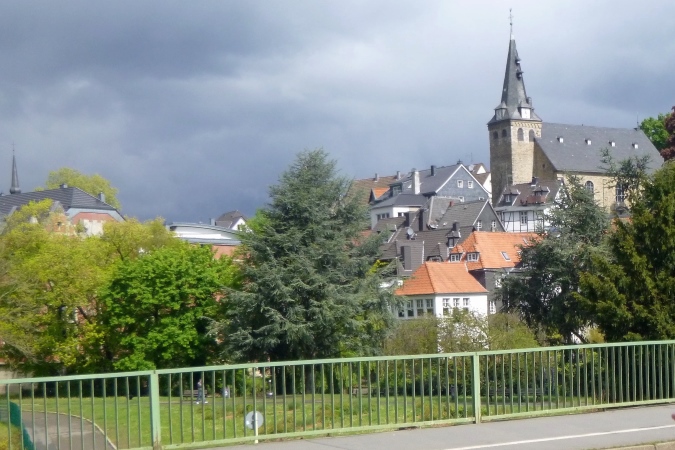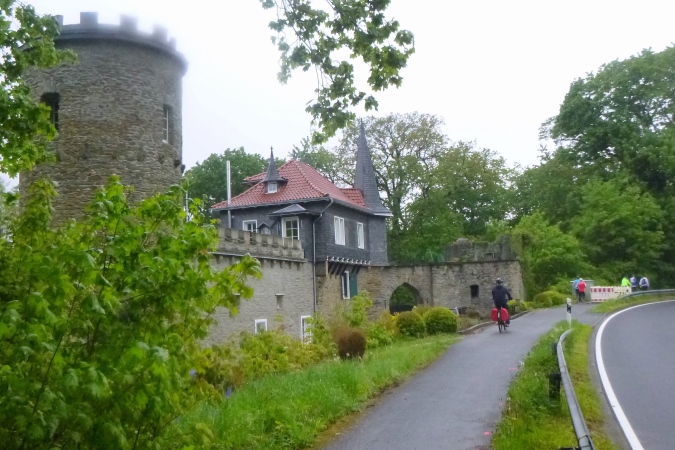 Velbert und Heiligenhaus bieten weder Aussicht noch Natur. Nur den ersten cut-off. Es gibt frische, süße Erdbeeren! Manche bleiben länger. Großer Fehler: Die Zeitmessung kommt hinter dem VP! Aber noch sind wir alle ungefährdet. Zwischen Häusern und Industriebauten, mal über die Hauptstraße rüber, mal in Hörweite der A535 ist es hier nicht wirklich attraktiv, dafür eher flach. Also Tempo und durch. So manch eine riesige Brücke erlaubt den Blick in ein tiefes, sehr tiefes Tal. Im Bahnhof Heiligenhaus erwischt uns ein Graupelschauer, dafür gibt’s Erdbeerquark. Ich will nicht mehr weg. Besonderheit: Deutschlands erste Waggonbrücke ersetzt hier eine normale. Sie haben einfach einen Bahnwaggon anstelle der alten Brücke eingebaut. Kurios.