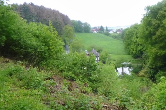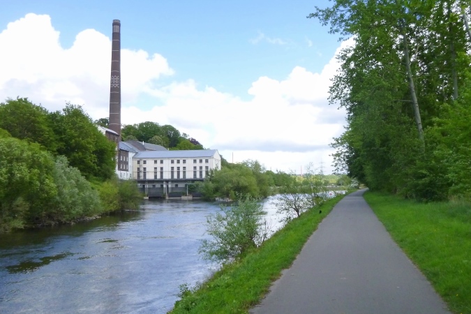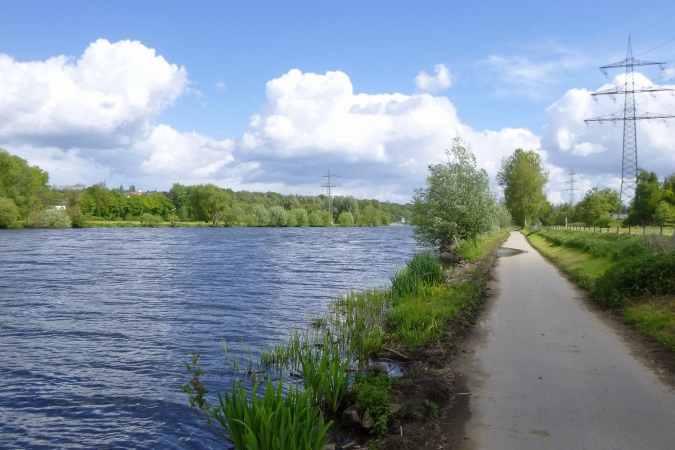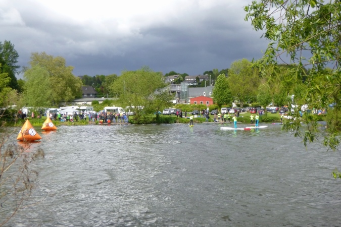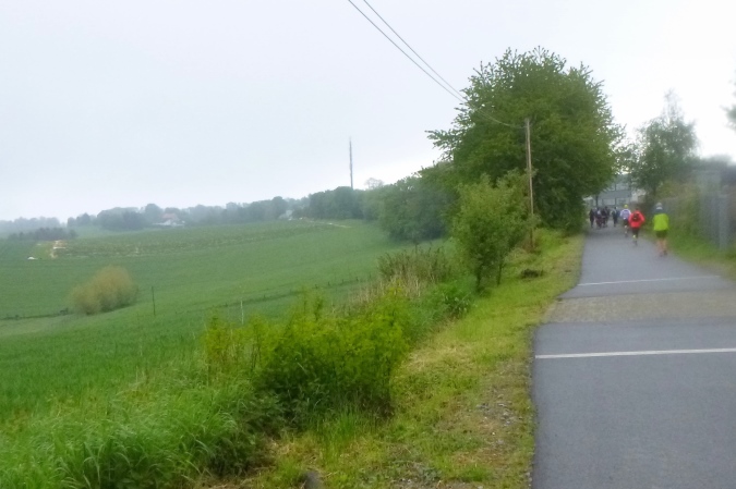 Es ist ein wirklich schönes Stück Flusstal hier, viele Kanuten und Flößer sind unterwegs. Es ist ein Leinpfad, also ein alter Treidelweg und steht sogar unter Denkmalschutz! In Hattingen müssen wir eine stark befahrene Straße queren. Die Ampel zeigt gefühlt 15 Min. rot, dann dürfen wir rüber. Auf einem Sportplatz ist der VP mit Zeitnahme. Alles passt, nettes Team und Sonnenschein. Aber genau hier beginnt der Anstieg. 15 km sanft, aber entschlossen berghoch. Und noch 4,5 Stunden bis Zielschluss.