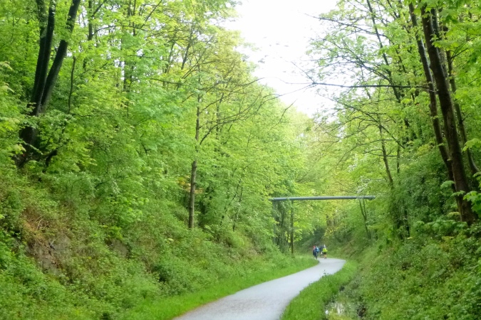 Hochinteressante Gespräche lenken von der doch deutlichen Steigung ab. Und plötzlich sind wir in Düssel. Im Dorf, nicht die Landeshauptstadt. Am VP gibt es warmen Tee, köstlich. Und weiter geht‘s nach Aprath, vorbei am Weiher. Nur noch ein wenig an der Straße lang, dann erreichen wir nach einem Zacken wieder die Natur und die Niederbergbahntrasse. Früher eine wichtige Verbindung vom Bergischen Land in die Essener Hüttenwerke. Auf dieser Trasse bleiben wir nun bis ins Ruhrtal.