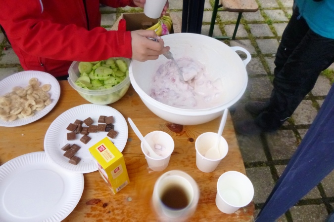 Mit einem leichten Niesel fängt es an, wirdstärker und als es so richtig prasselt, sitzen wir am besten VP von allen im Trockenen! Richtig heiße Brühe, nette Leute und Musik nach Wunsch! Bei Across the mountains von Vangelis kommen mir die Tränen…