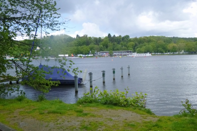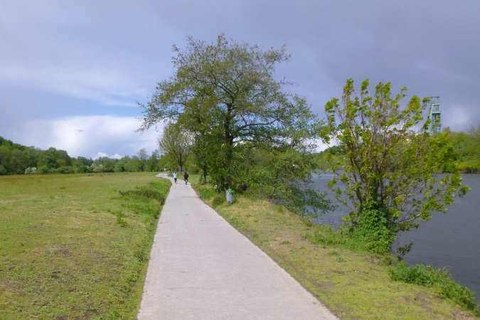 Wer jetzt weiterläuft, erlebt ein Bergabstück mitten durch Wald, über Einschnitte und Hügel. Und mit Fernsicht, denn ein riesiger Viadukt kurz vor Kettwig wird überquert. Dann haben wir die Ruhr erreicht. Peter aus Rostock begleitet mich ein Stück, dann der VP. Der Himmel wird blau, der Wind bläst von hinten, satt und zufrieden läuft‘s/geht’s weiter. Das war also die Marathon-Distanz. Michael aus Werl entschließt sich, mich bis zum Schluss zu ertragen, gemeinsam bewegen wir uns an der Ruhr entlang auf Werden zu, wo der Baldeneysee beginnt.