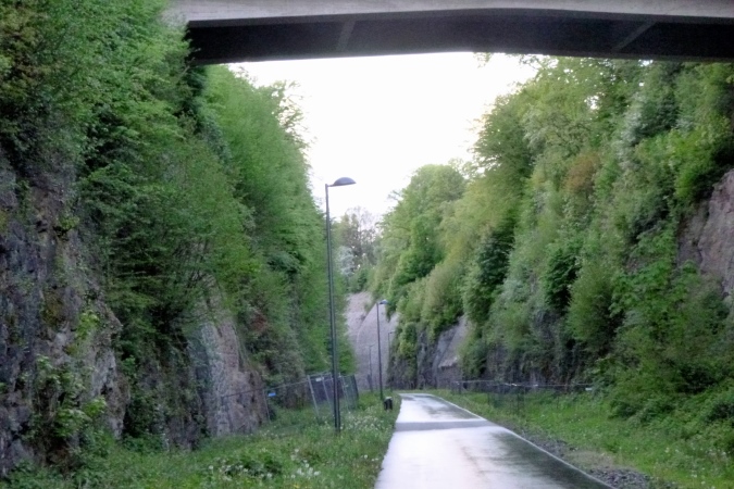Um auf Höhe und wieder runter zu kommen, macht die Strecke riesige Bögen, meist durch wunderbare Natur. Am Zeittunnel Wülfrath steht ein VP, wir kürzen einen Riesenbogen ab und steigen die 6 HM kurzerhand hoch und auf der Trasse dann weiter. Wahnsinnsaussichten belohnen uns oben. Wären da nicht die trüben Wolken.