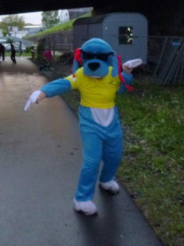 Im Tunnel Schee ist der Brechpunkt, von da an geht’s abwärts. So jedenfalls der Plan. Die Radler merken, sie müssen nicht mehr treten. Ich merke nichts von dem 60HM-Abstieg, mir kommt das völlig flach vor. Und laufen- das geht auch nicht wirklich. Da ist so eine vage Übelkeit. Kommt aber nicht vom Bier, die war vorher schon. Die Erschütterungen beim Laufen tun da nicht gut, also stramm marschiert. Bei km 93 noch der allerletzte VP, diesmal mit tanzendem Hund. Das ist keine Halluzination.