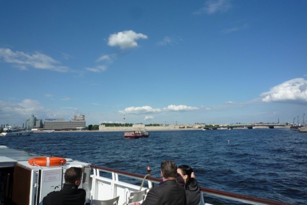 Die Laufroute führt zwar entlang der bekanntesten Sehenswürdigkeiten von St. Petersburg, aber es ist mir daran gelegen, die Gebäude länger zu betrachten und in aller Ruhe einige Fotos zu machen. Die vielen Gemälde im Kunstmuseum in der Eremitage habe ich im Juli 2000 schon einmal stundenlang besichtigt. Ich nehme einen Hop-on, Hop-off-Bus für 700 Rubel. Das Wetter ist so schön, dass man es bei offenem Dach gut aushält und viele Fotomotive erblickt. Wer nicht will, braucht nicht auszusteigen bzw. hält sich an die genauen Abfahrtszeiten. Am späteren Nachmittag buche ich um 650 Rubel eine in Englisch geführte Bootstour auf der Newa, dem Fluss, der die Stadt mäanderartig durchfliest. In vielen Kanälen kann man mit den Booten wie in Venedig auch abgeschiedene Orte erreichen.