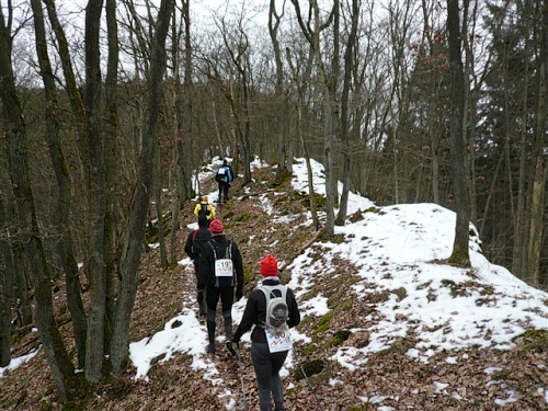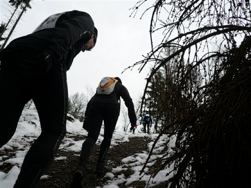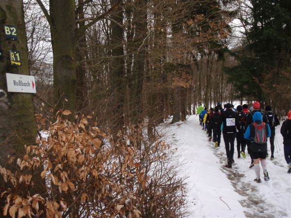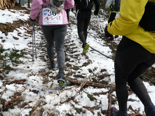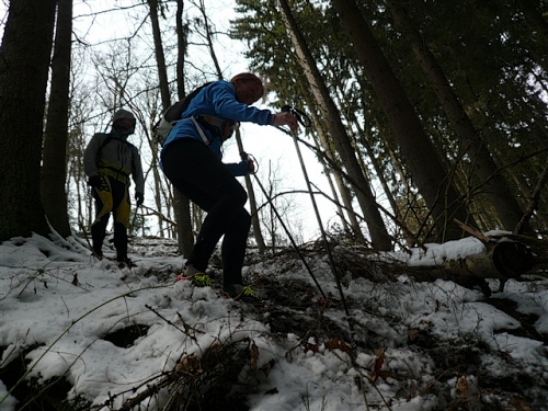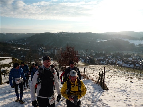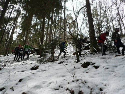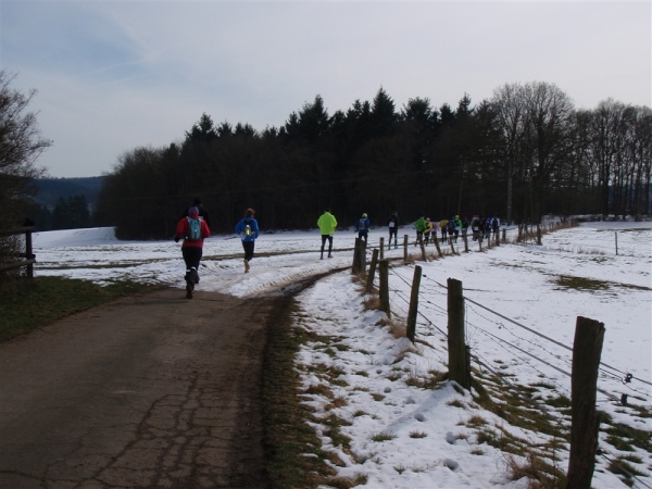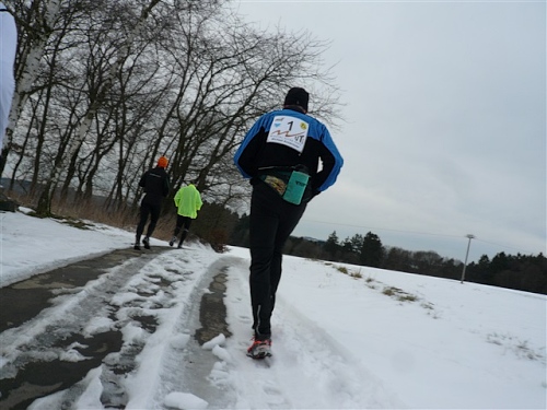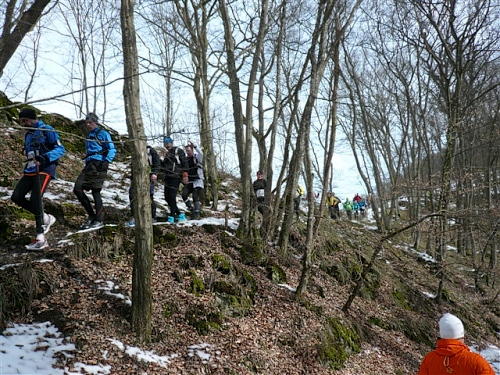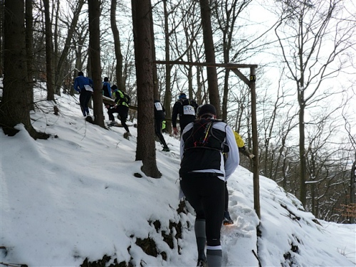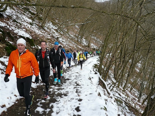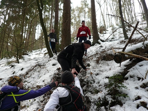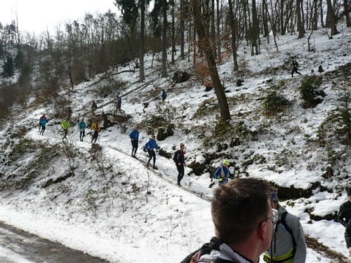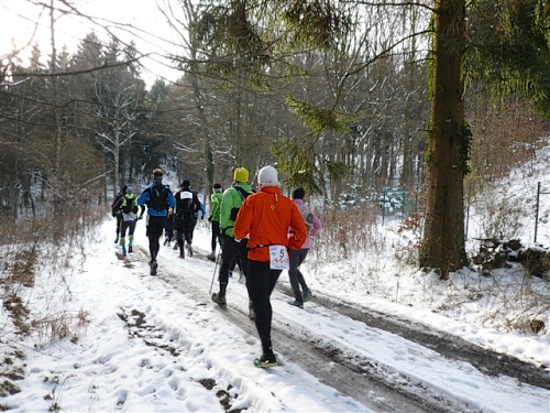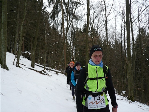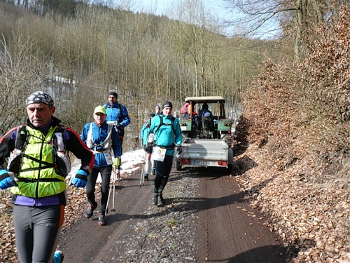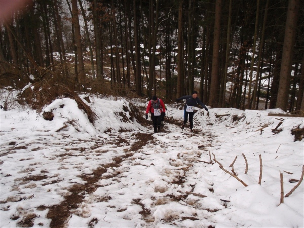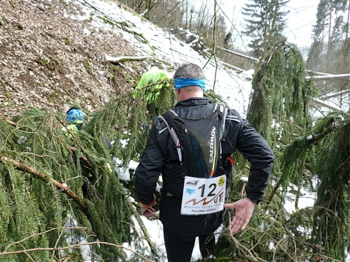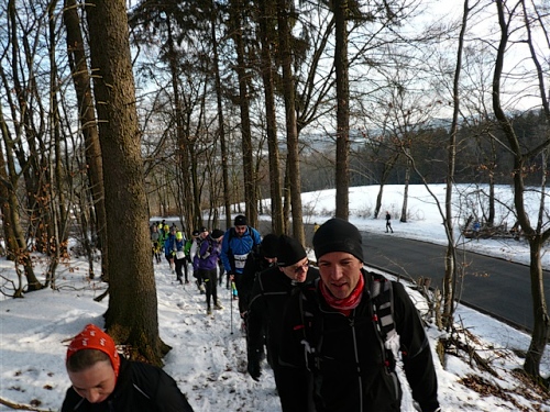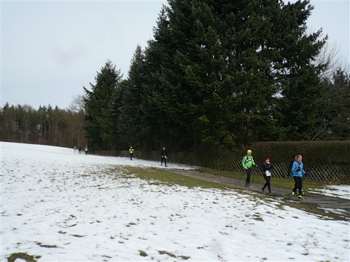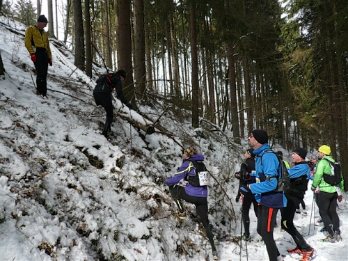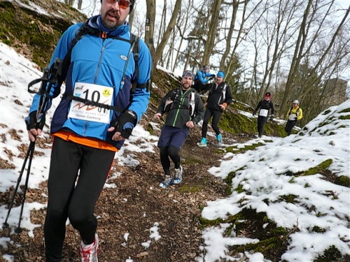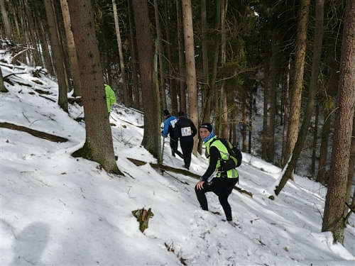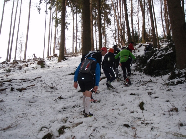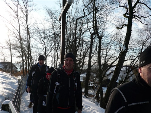 Das Beste sollte man bis zum Schluß aufsparen. Nach dieser Devise ist auch dieser Trail-Lauf konzipiert. Deshalb erreichen wir zu Beginn der letzten Etappe erst den steilsten Anstieg. Der untere Teil ist bereits schneefrei. So kommen wir ohne großes Rutschen nach oben. Ansonsten hätten wir wohl wie Käfer emporkrabbeln dürfen. Erstaunlich, welche Power manch einer jetzt noch an den Tag legt. Ich bin froh, oben angekommen noch ein paar Meter gehen zu dürfen. Langsam fällt es schwer, wieder in Gang zu kommen. Das macht die Aufgabe von Jochen nicht einfacher, sorgt er doch heute als Besenwagen dafür, daß keiner verloren geht.