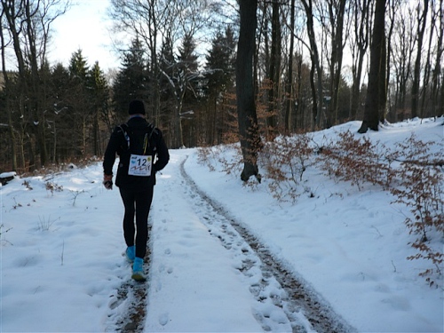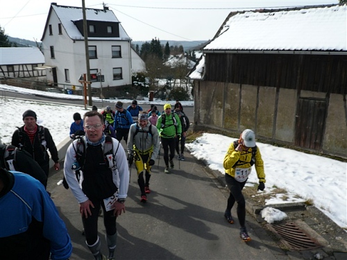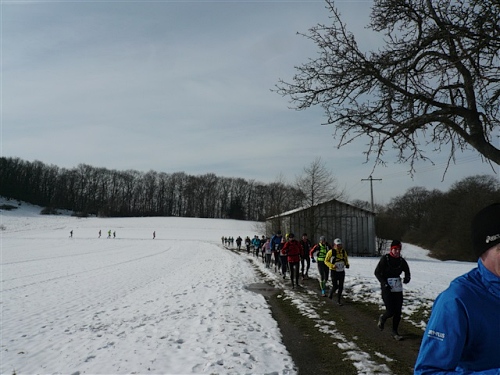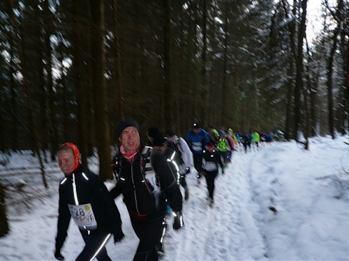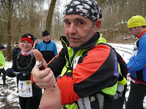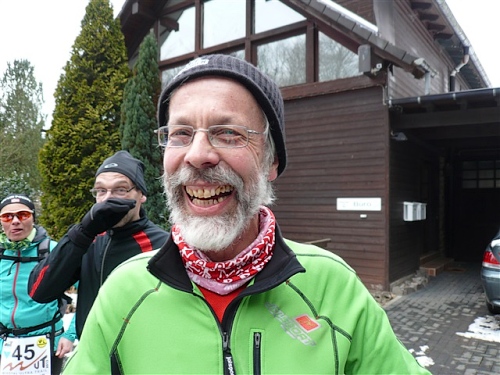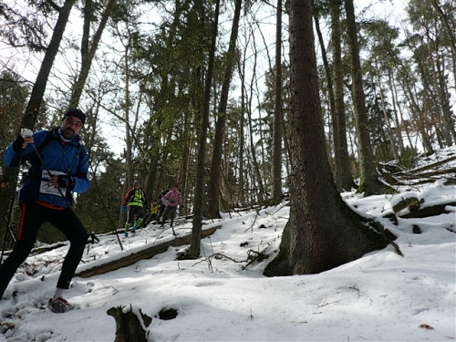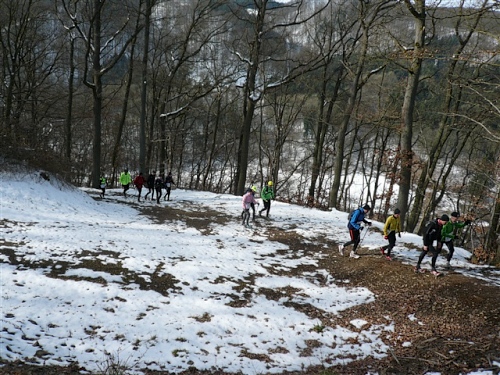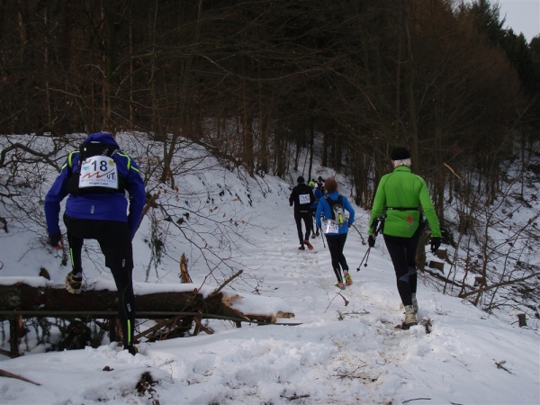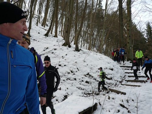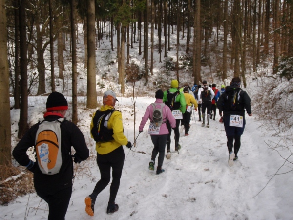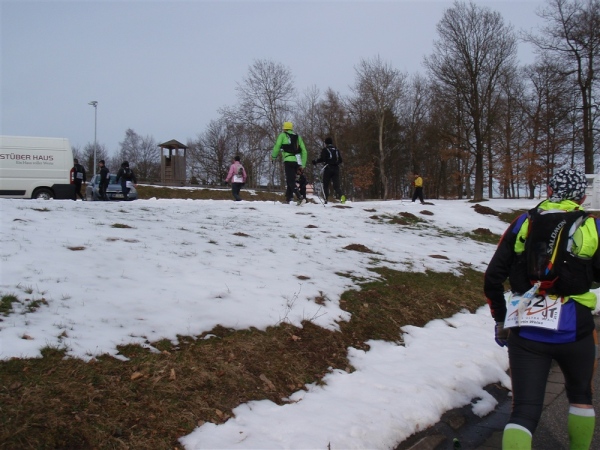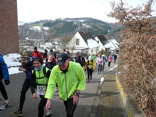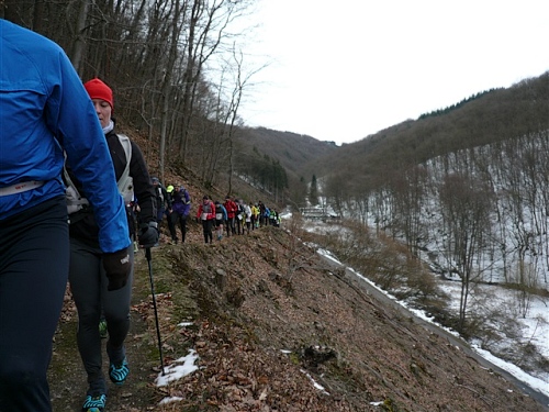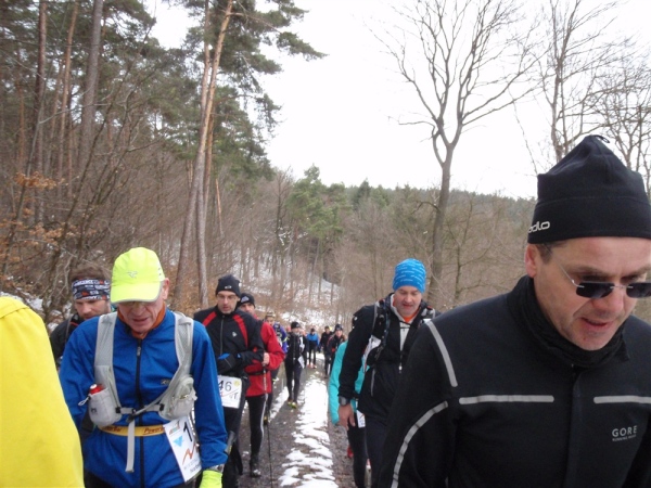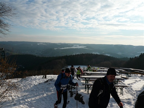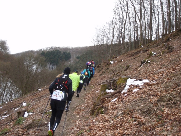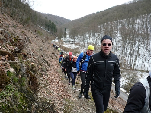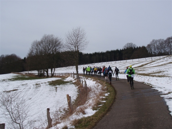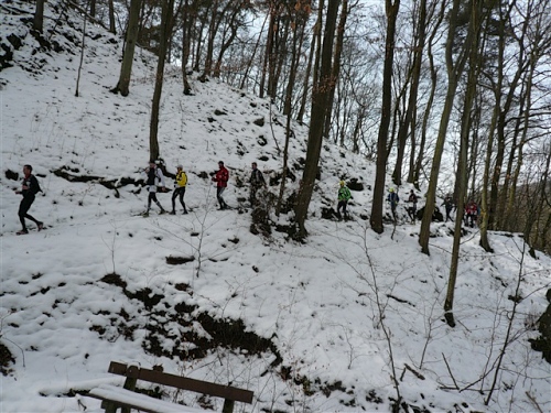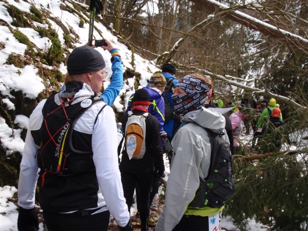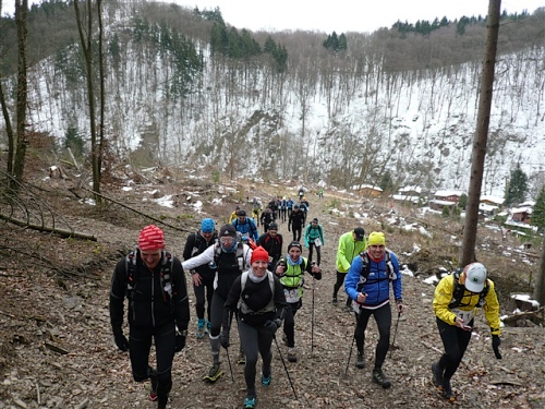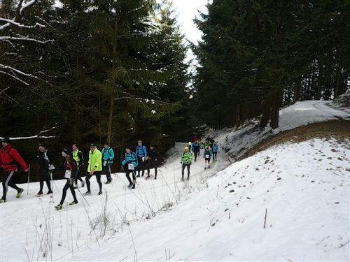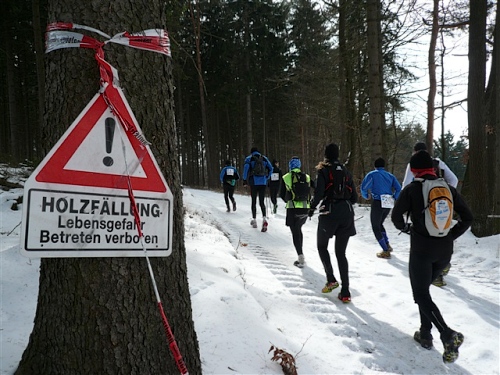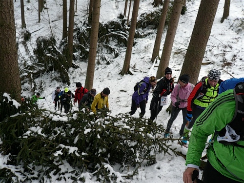 Das Beste sollte man bis zum Schluß aufsparen. Nach dieser Devise ist auch dieser Trail-Lauf konzipiert. Deshalb erreichen wir zu Beginn der letzten Etappe erst den steilsten Anstieg. Der untere Teil ist bereits schneefrei. So kommen wir ohne großes Rutschen nach oben. Ansonsten hätten wir wohl wie Käfer emporkrabbeln dürfen. Erstaunlich, welche Power manch einer jetzt noch an den Tag legt. Ich bin froh, oben angekommen noch ein paar Meter gehen zu dürfen. Langsam fällt es schwer, wieder in Gang zu kommen. Das macht die Aufgabe von Jochen nicht einfacher, sorgt er doch heute als Besenwagen dafür, daß keiner verloren geht.