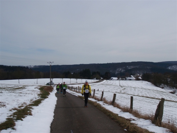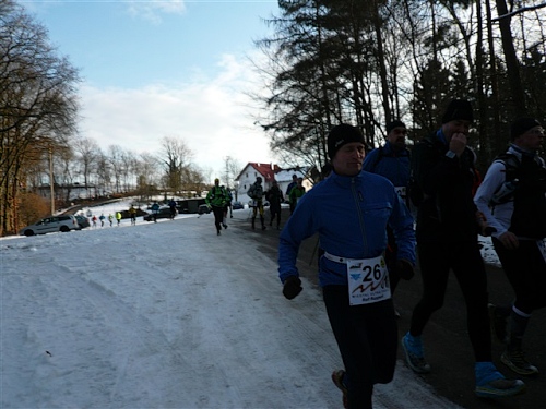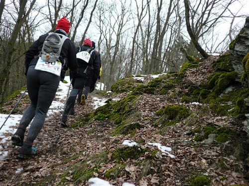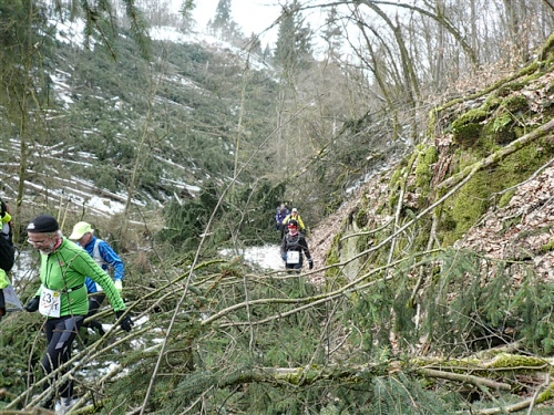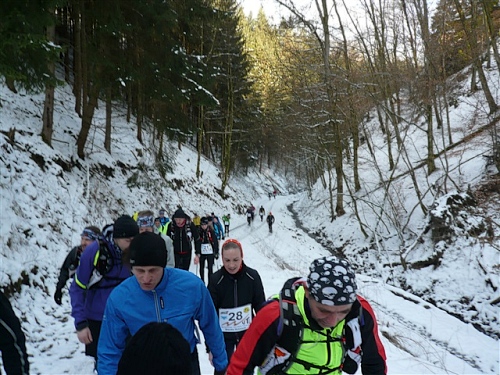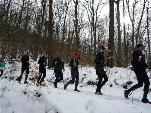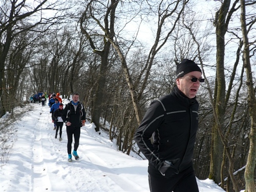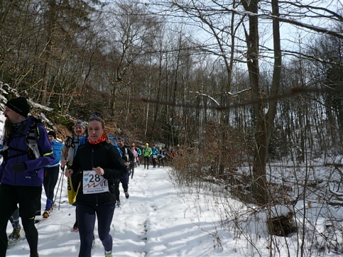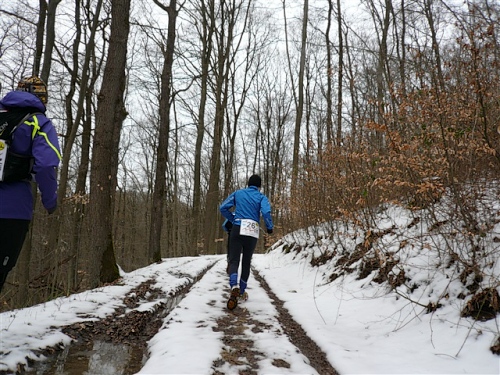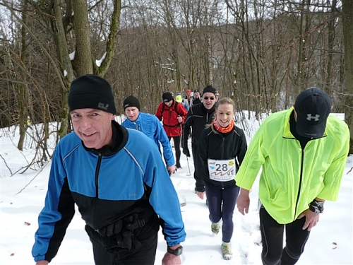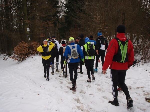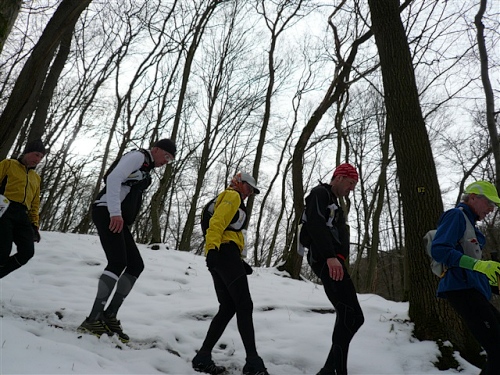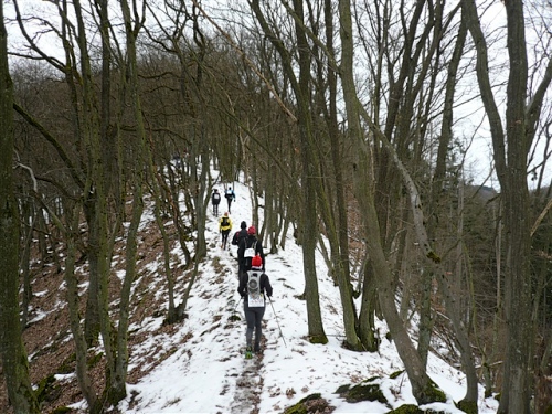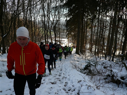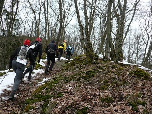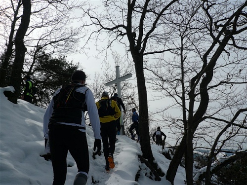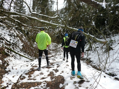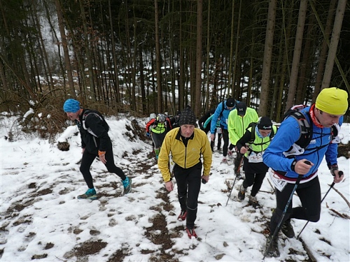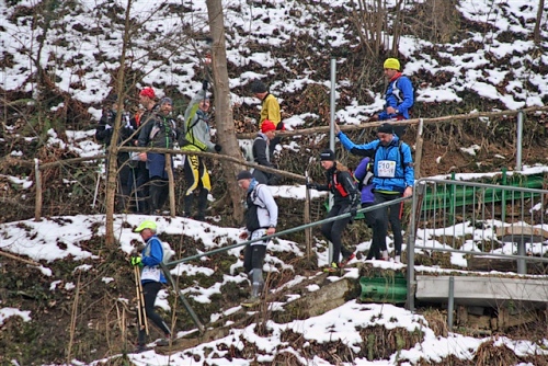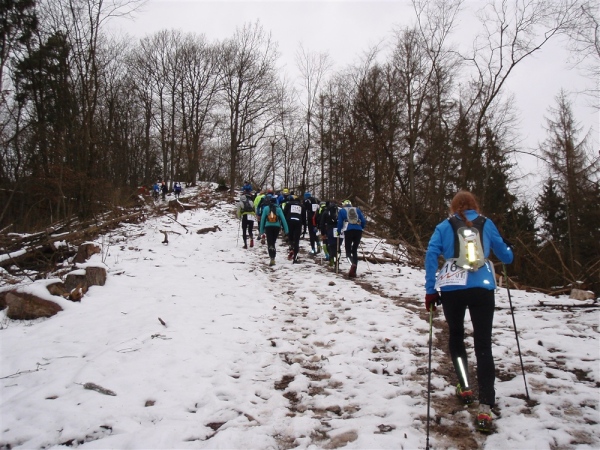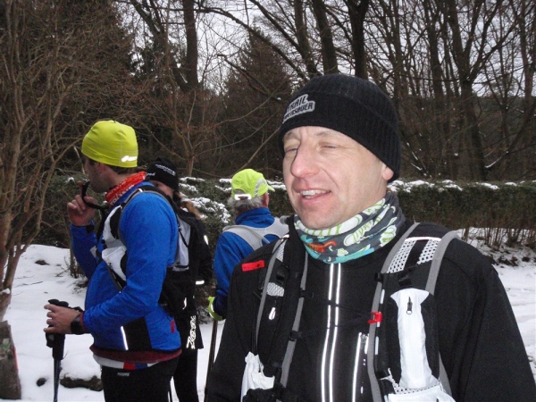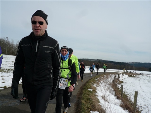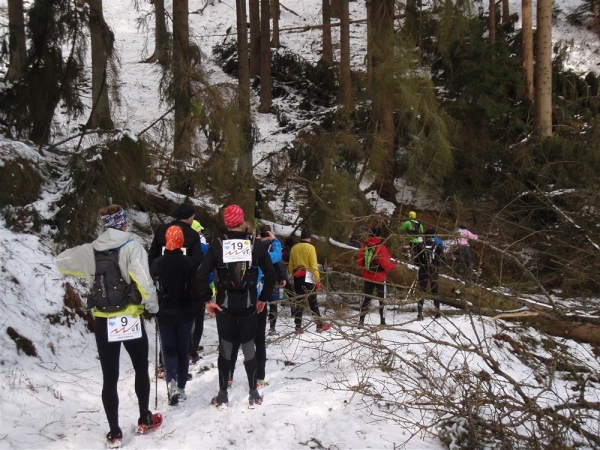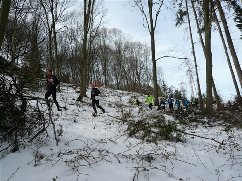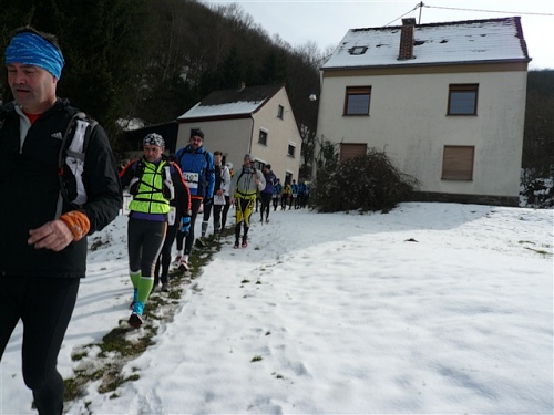 Das Beste sollte man bis zum Schluß aufsparen. Nach dieser Devise ist auch dieser Trail-Lauf konzipiert. Deshalb erreichen wir zu Beginn der letzten Etappe erst den steilsten Anstieg. Der untere Teil ist bereits schneefrei. So kommen wir ohne großes Rutschen nach oben. Ansonsten hätten wir wohl wie Käfer emporkrabbeln dürfen. Erstaunlich, welche Power manch einer jetzt noch an den Tag legt. Ich bin froh, oben angekommen noch ein paar Meter gehen zu dürfen. Langsam fällt es schwer, wieder in Gang zu kommen. Das macht die Aufgabe von Jochen nicht einfacher, sorgt er doch heute als Besenwagen dafür, daß keiner verloren geht.
