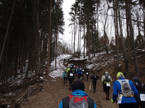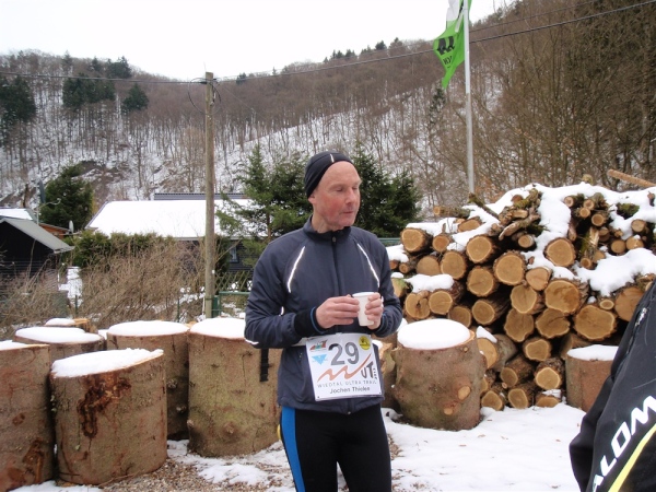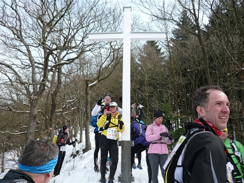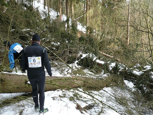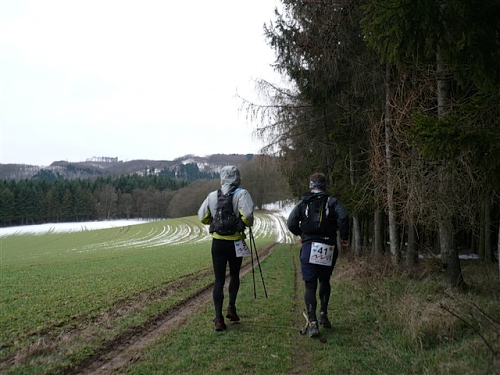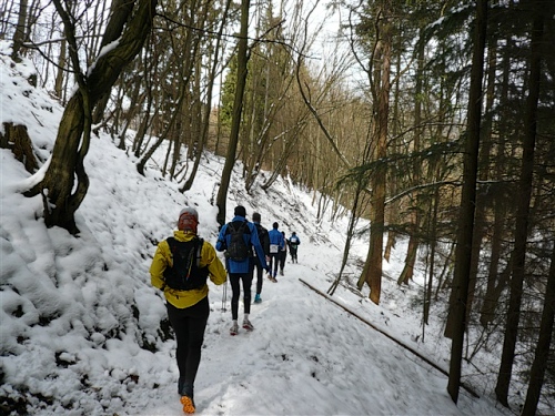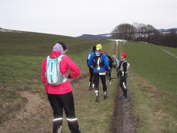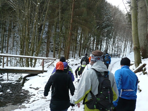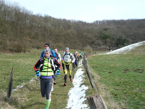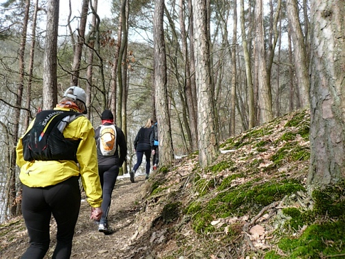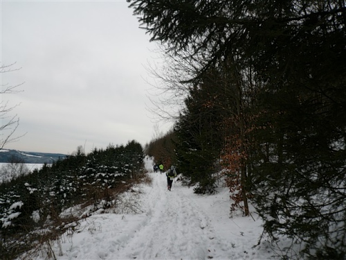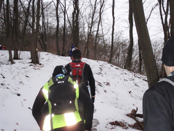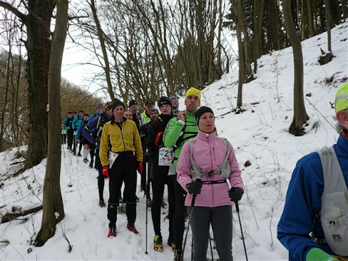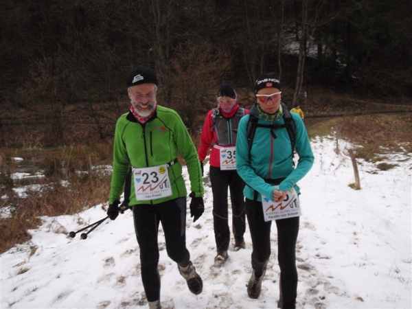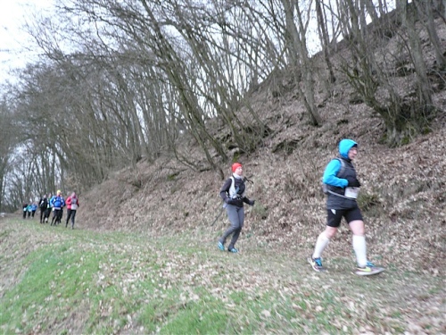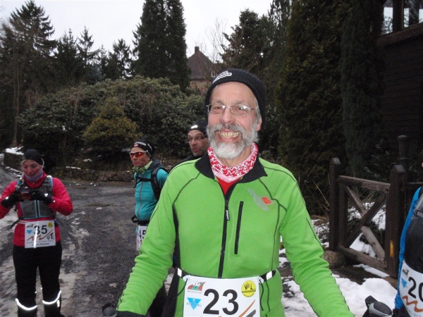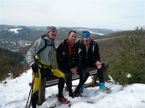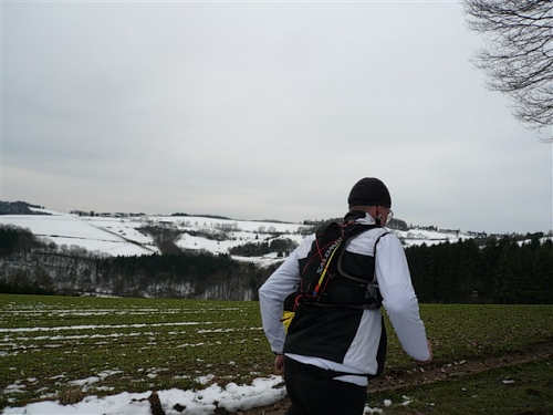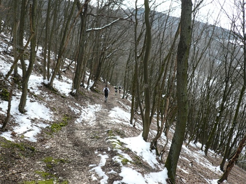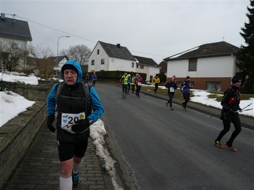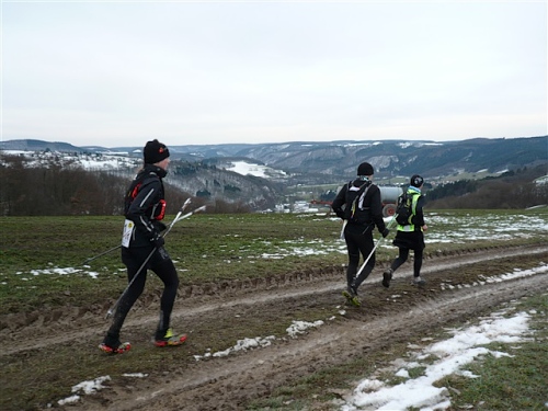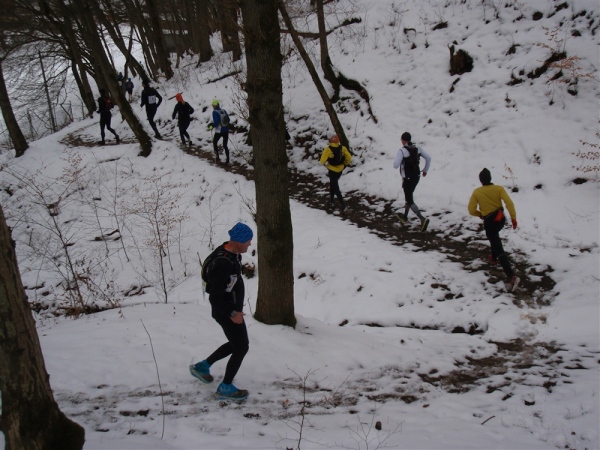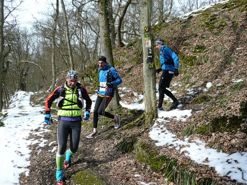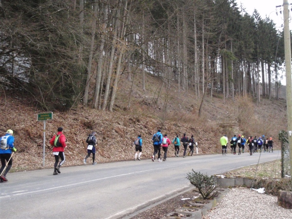 Das Beste sollte man bis zum Schluß aufsparen. Nach dieser Devise ist auch dieser Trail-Lauf konzipiert. Deshalb erreichen wir zu Beginn der letzten Etappe erst den steilsten Anstieg. Der untere Teil ist bereits schneefrei. So kommen wir ohne großes Rutschen nach oben. Ansonsten hätten wir wohl wie Käfer emporkrabbeln dürfen. Erstaunlich, welche Power manch einer jetzt noch an den Tag legt. Ich bin froh, oben angekommen noch ein paar Meter gehen zu dürfen. Langsam fällt es schwer, wieder in Gang zu kommen. Das macht die Aufgabe von Jochen nicht einfacher, sorgt er doch heute als Besenwagen dafür, daß keiner verloren geht.