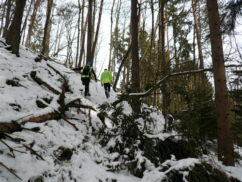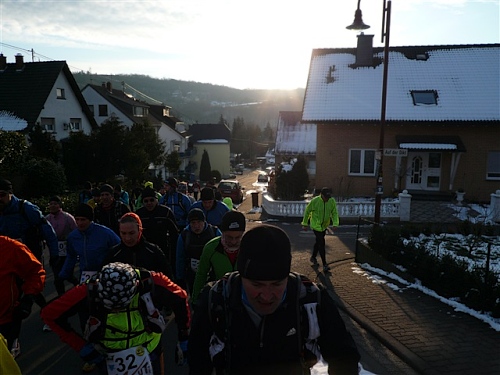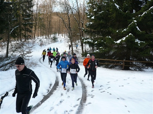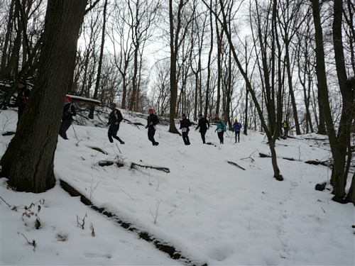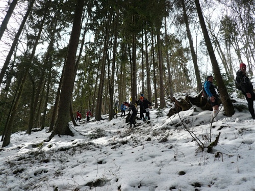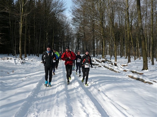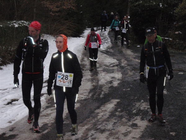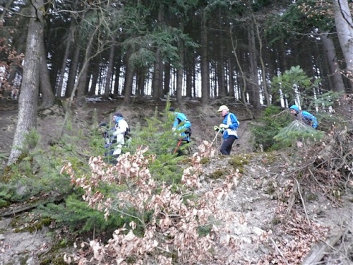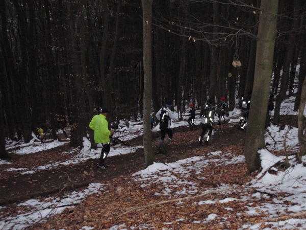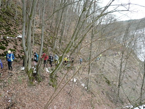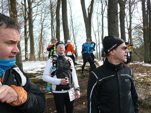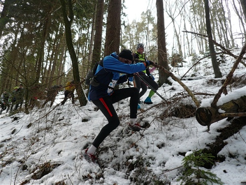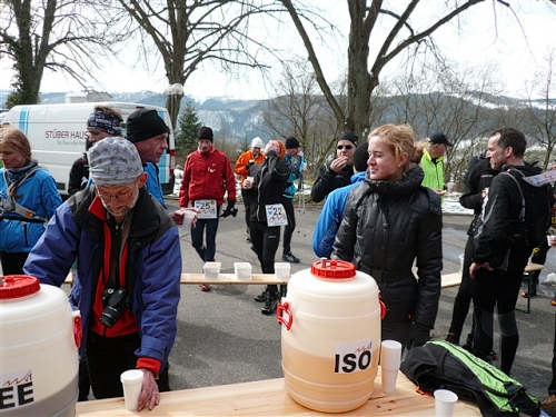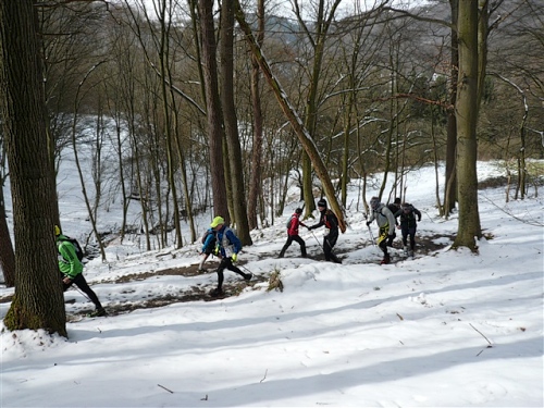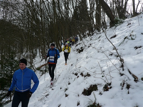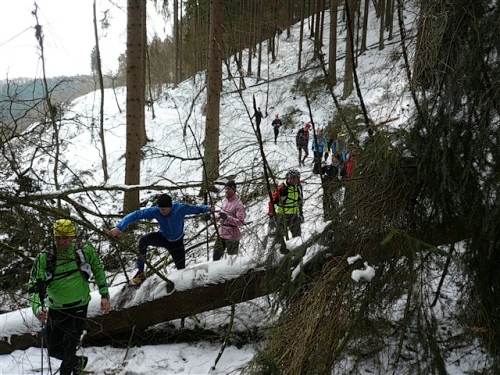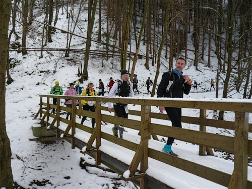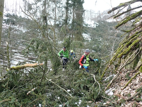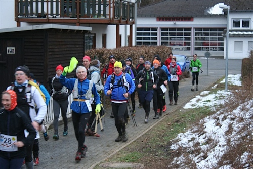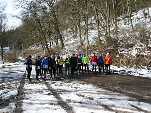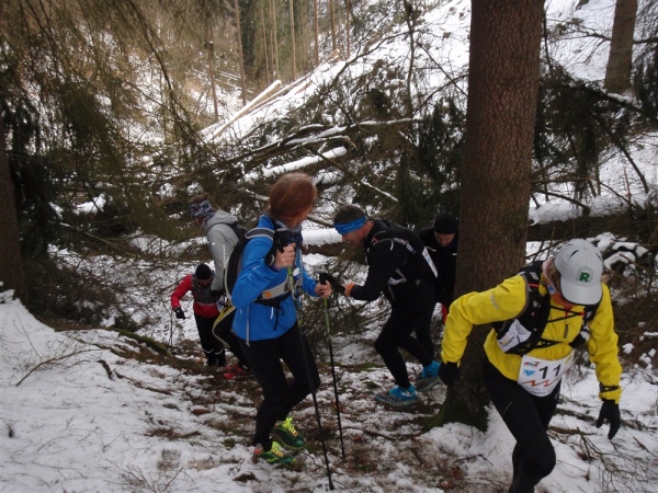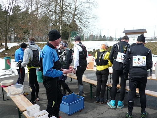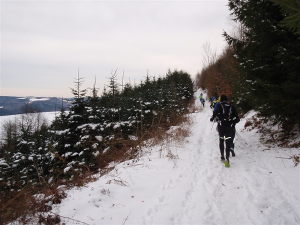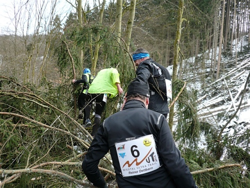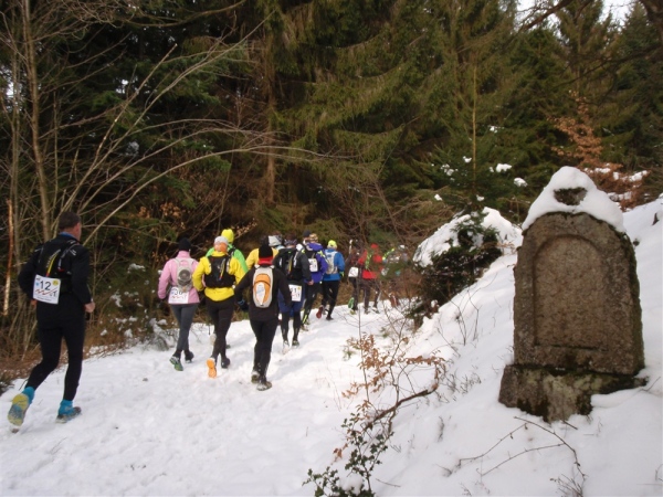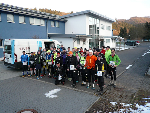 Das Beste sollte man bis zum Schluß aufsparen. Nach dieser Devise ist auch dieser Trail-Lauf konzipiert. Deshalb erreichen wir zu Beginn der letzten Etappe erst den steilsten Anstieg. Der untere Teil ist bereits schneefrei. So kommen wir ohne großes Rutschen nach oben. Ansonsten hätten wir wohl wie Käfer emporkrabbeln dürfen. Erstaunlich, welche Power manch einer jetzt noch an den Tag legt. Ich bin froh, oben angekommen noch ein paar Meter gehen zu dürfen. Langsam fällt es schwer, wieder in Gang zu kommen. Das macht die Aufgabe von Jochen nicht einfacher, sorgt er doch heute als Besenwagen dafür, daß keiner verloren geht.