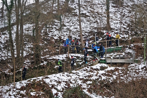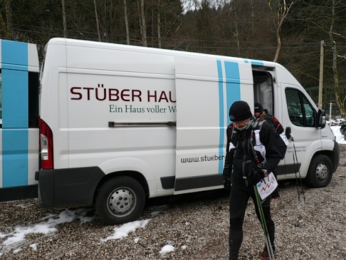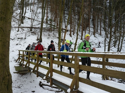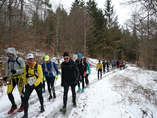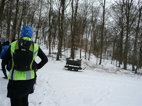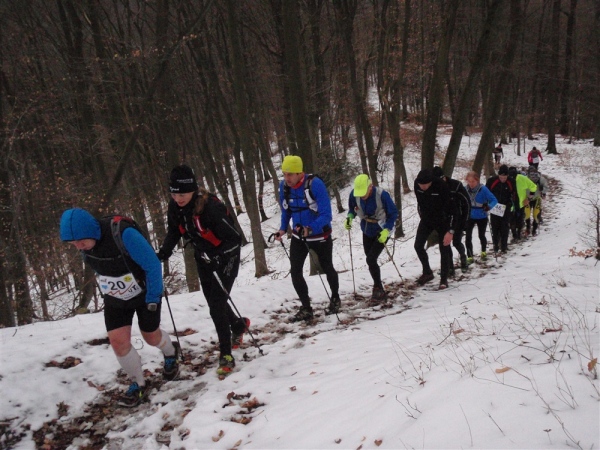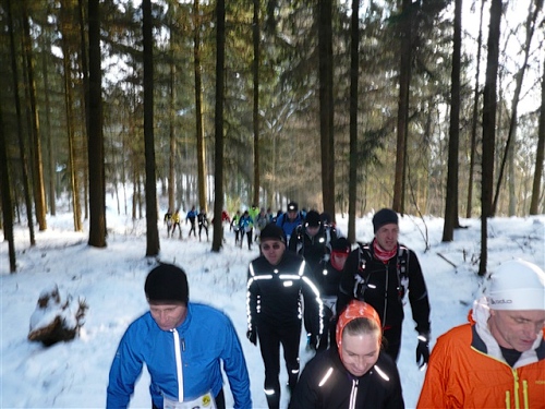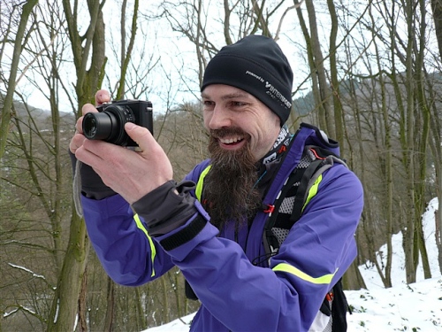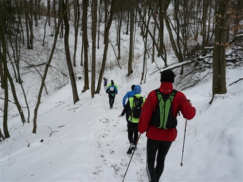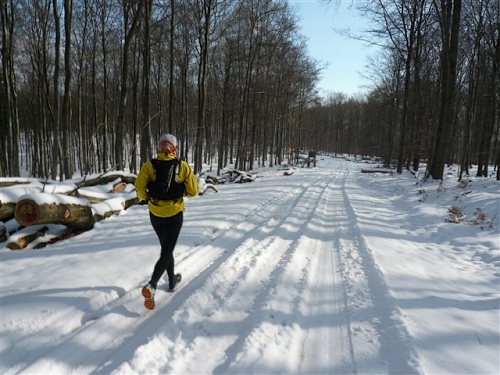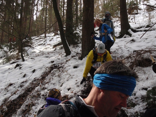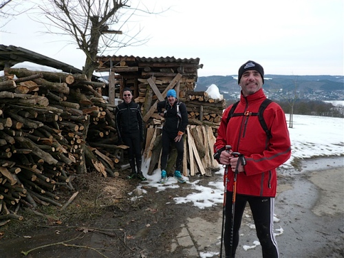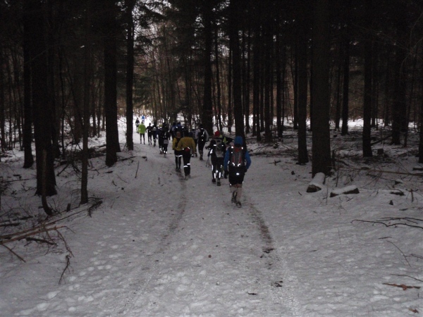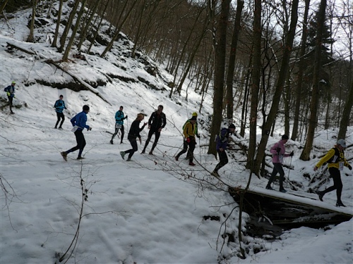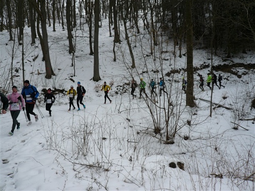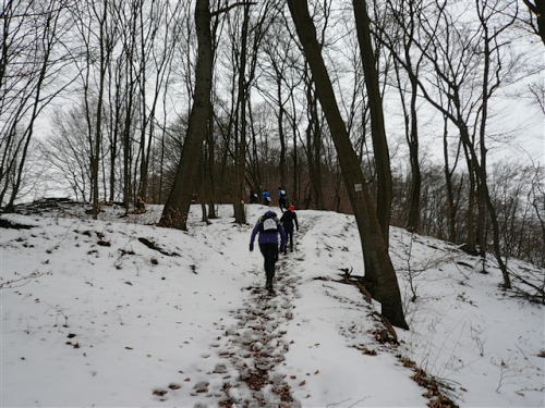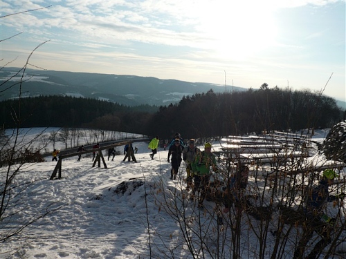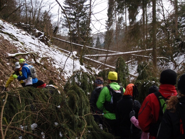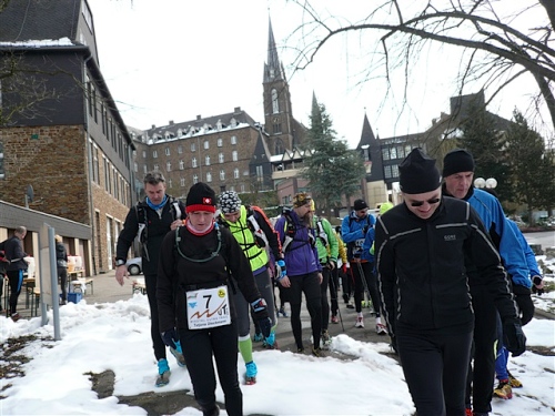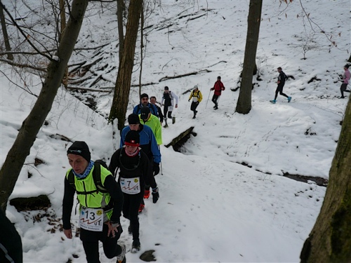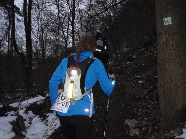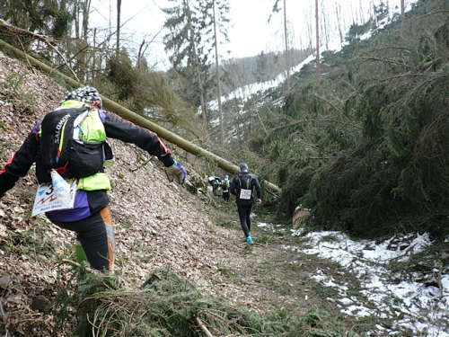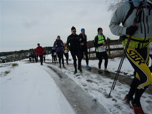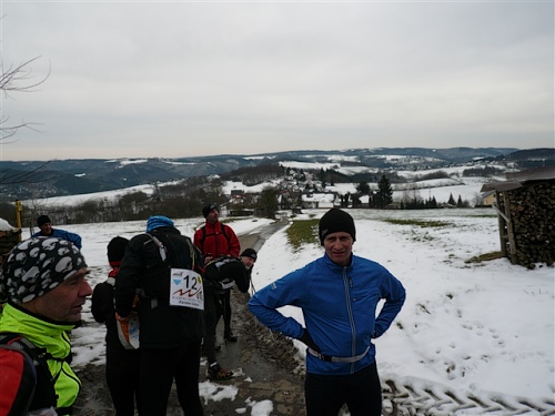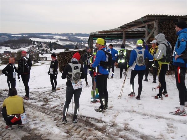 Das Beste sollte man bis zum Schluß aufsparen. Nach dieser Devise ist auch dieser Trail-Lauf konzipiert. Deshalb erreichen wir zu Beginn der letzten Etappe erst den steilsten Anstieg. Der untere Teil ist bereits schneefrei. So kommen wir ohne großes Rutschen nach oben. Ansonsten hätten wir wohl wie Käfer emporkrabbeln dürfen. Erstaunlich, welche Power manch einer jetzt noch an den Tag legt. Ich bin froh, oben angekommen noch ein paar Meter gehen zu dürfen. Langsam fällt es schwer, wieder in Gang zu kommen. Das macht die Aufgabe von Jochen nicht einfacher, sorgt er doch heute als Besenwagen dafür, daß keiner verloren geht.