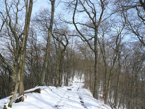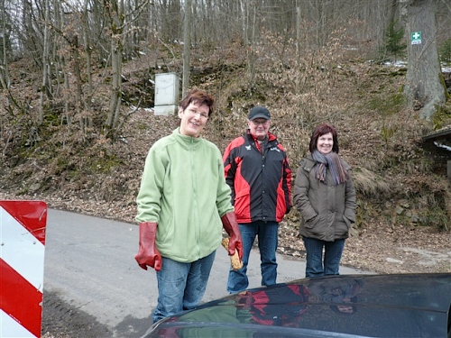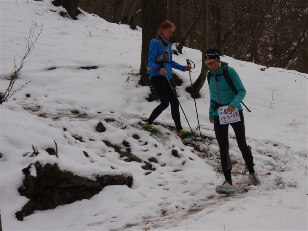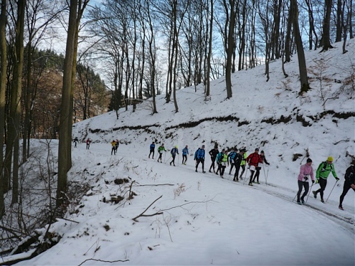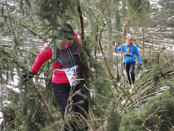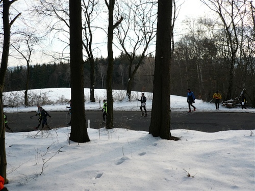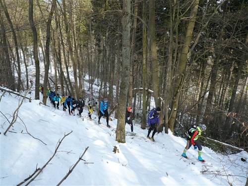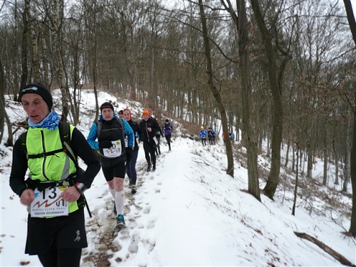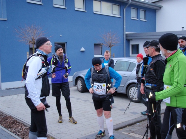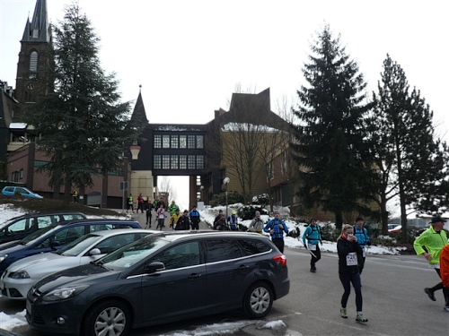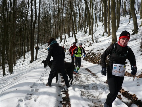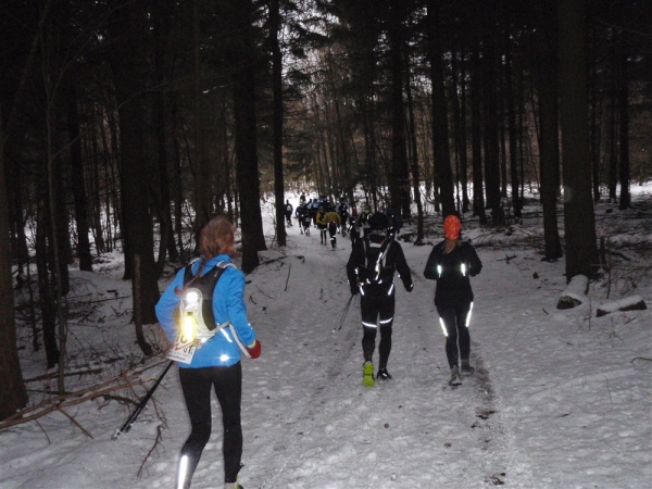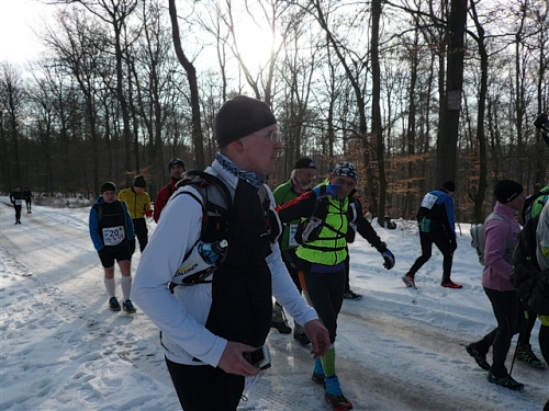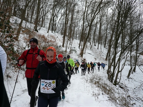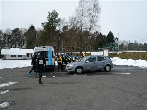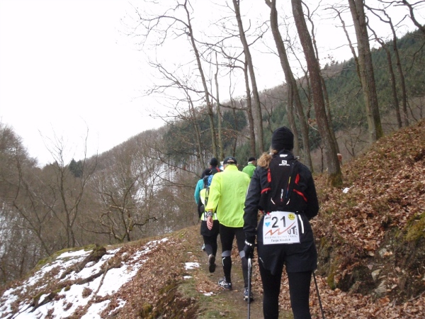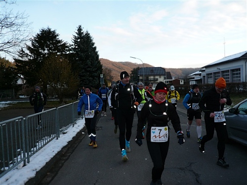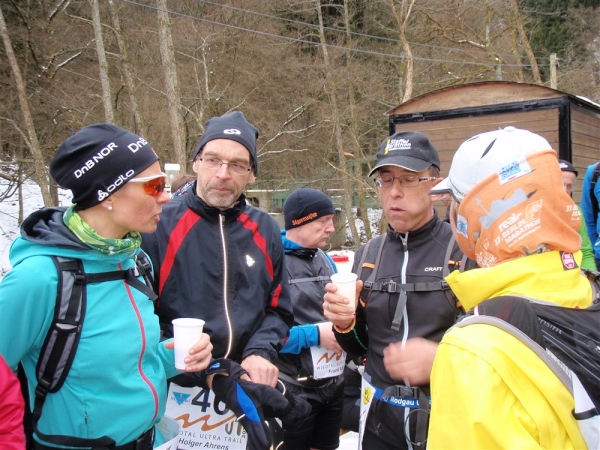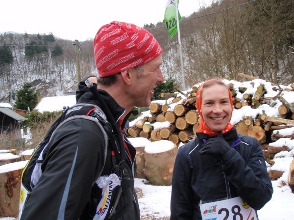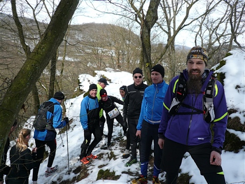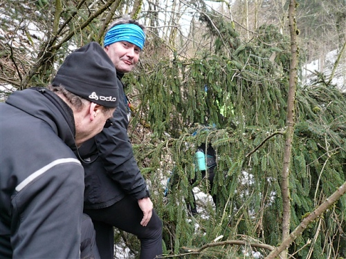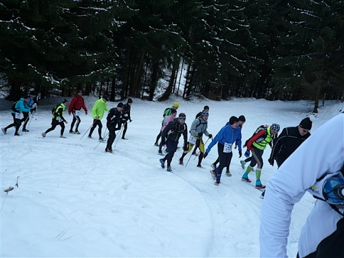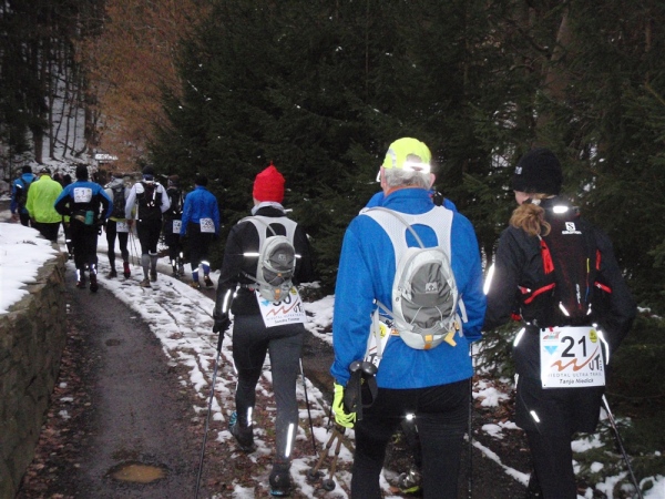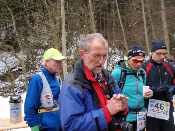 Das Beste sollte man bis zum Schluß aufsparen. Nach dieser Devise ist auch dieser Trail-Lauf konzipiert. Deshalb erreichen wir zu Beginn der letzten Etappe erst den steilsten Anstieg. Der untere Teil ist bereits schneefrei. So kommen wir ohne großes Rutschen nach oben. Ansonsten hätten wir wohl wie Käfer emporkrabbeln dürfen. Erstaunlich, welche Power manch einer jetzt noch an den Tag legt. Ich bin froh, oben angekommen noch ein paar Meter gehen zu dürfen. Langsam fällt es schwer, wieder in Gang zu kommen. Das macht die Aufgabe von Jochen nicht einfacher, sorgt er doch heute als Besenwagen dafür, daß keiner verloren geht.