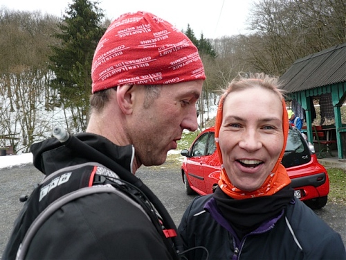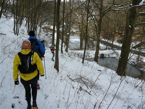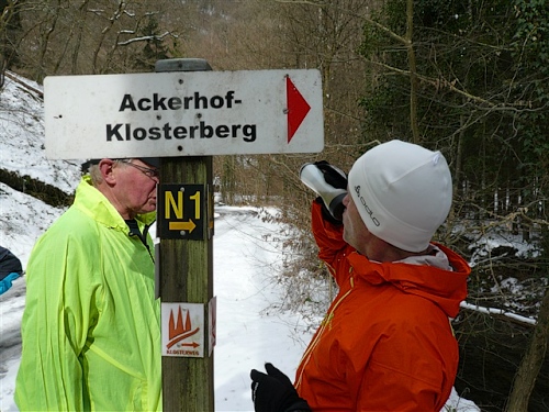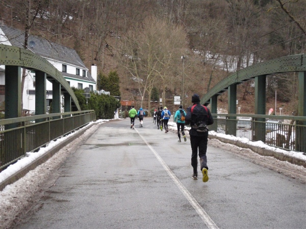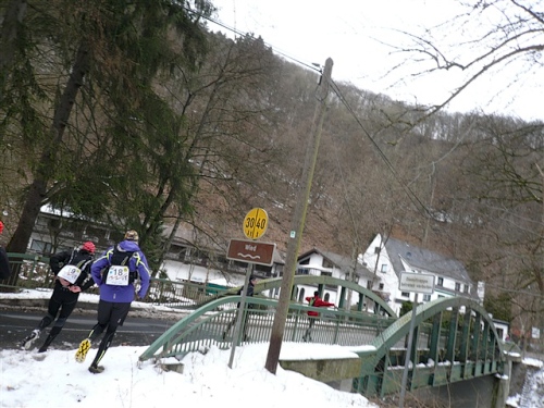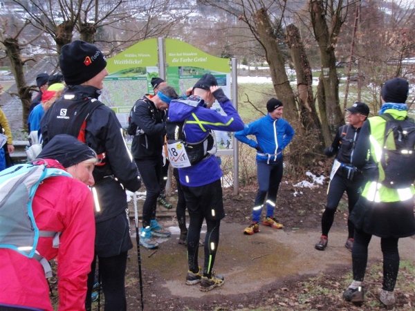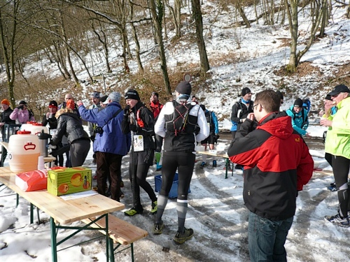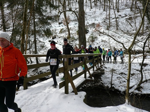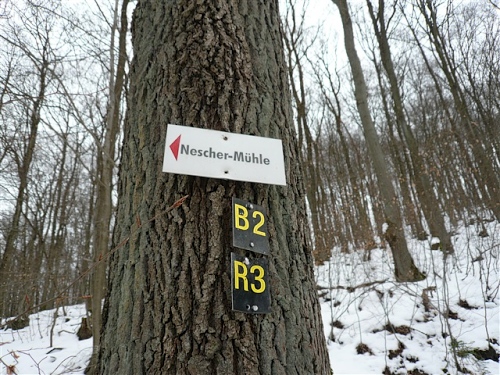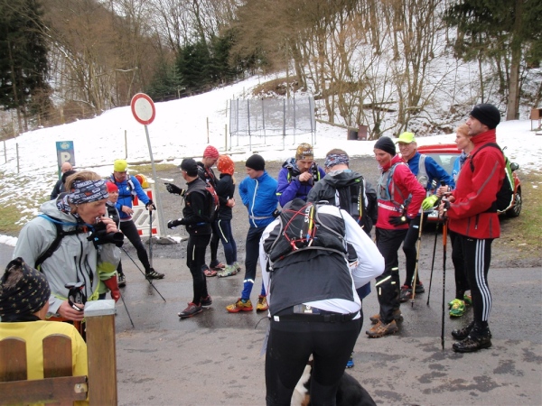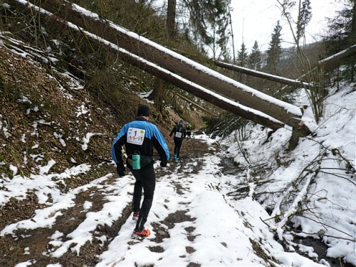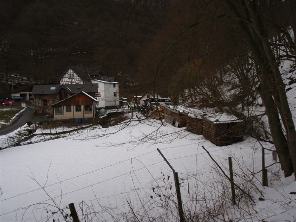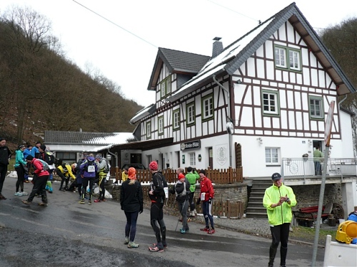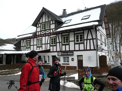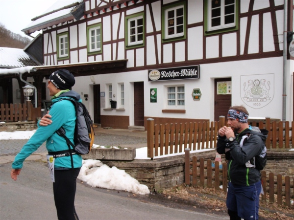 Auf den folgenden Waldwegen beginnt der Trail seinem Namen alle Ehre zu machen. Bei leichten Plusgraden ist der Boden mehr und mehr aufgeweicht. Der zentimetertiefe Schnee wechselt sich mit ebenso tiefem Schlamm ab. Wer heute sauber ins Ziel kommt, kann nur geschummelt haben. Der Weg hinab zur Neschermühle wird zur Rutschpartie. Das Restaurant ist zur Zeit zwar geschlossen aber die Wirtsleute sind offen gegenüber uns Läufern und bieten die Möglichkeit, das stille Örtchen aufzusuchen. Wer diese Möglichkeit nicht nutzt, hat eine weitere Verschnaufpause.