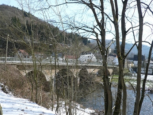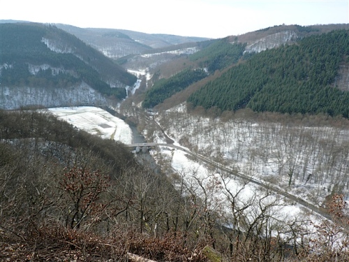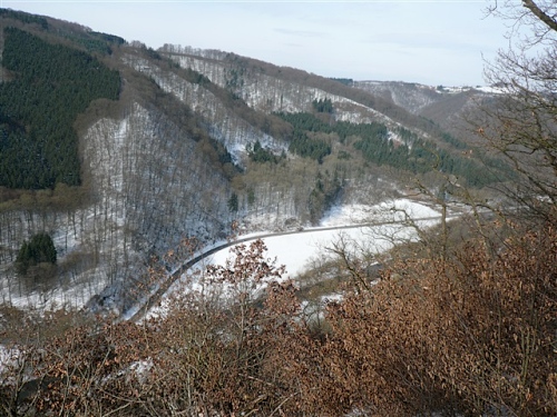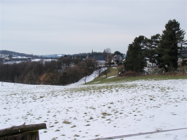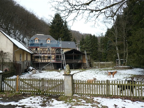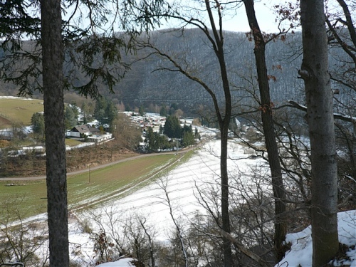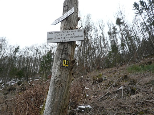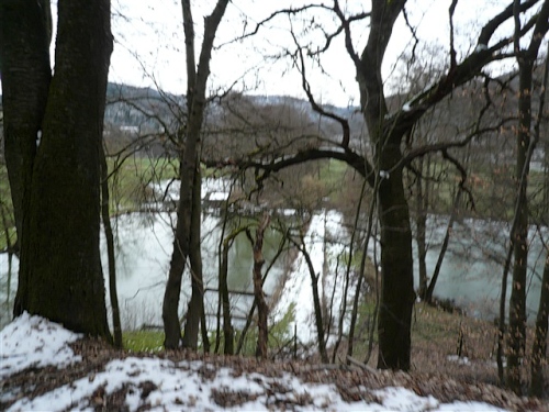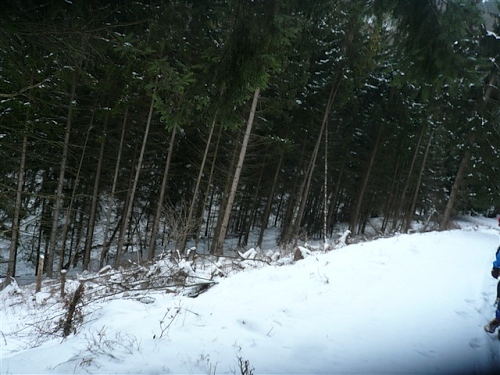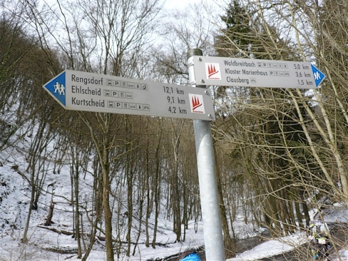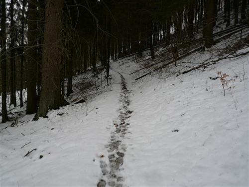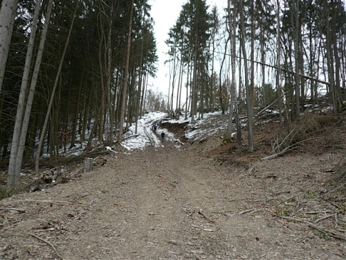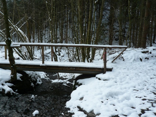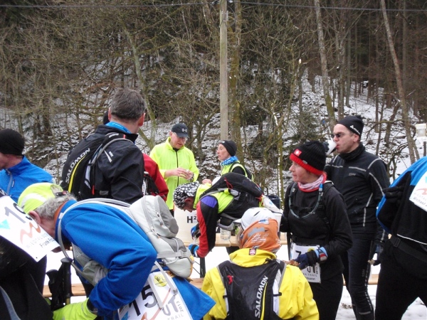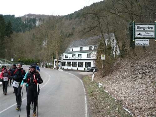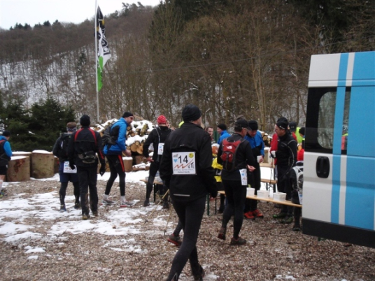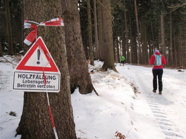 Auf den folgenden Waldwegen beginnt der Trail seinem Namen alle Ehre zu machen. Bei leichten Plusgraden ist der Boden mehr und mehr aufgeweicht. Der zentimetertiefe Schnee wechselt sich mit ebenso tiefem Schlamm ab. Wer heute sauber ins Ziel kommt, kann nur geschummelt haben. Der Weg hinab zur Neschermühle wird zur Rutschpartie. Das Restaurant ist zur Zeit zwar geschlossen aber die Wirtsleute sind offen gegenüber uns Läufern und bieten die Möglichkeit, das stille Örtchen aufzusuchen. Wer diese Möglichkeit nicht nutzt, hat eine weitere Verschnaufpause.