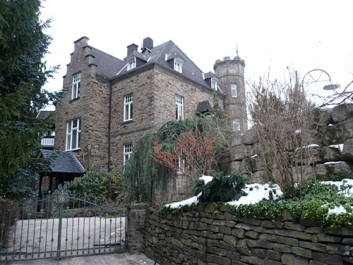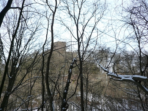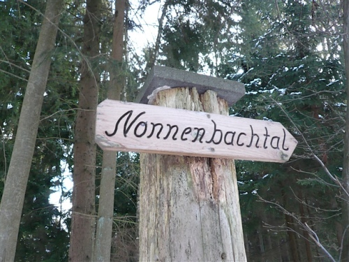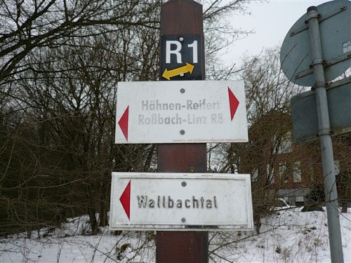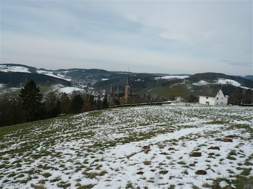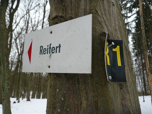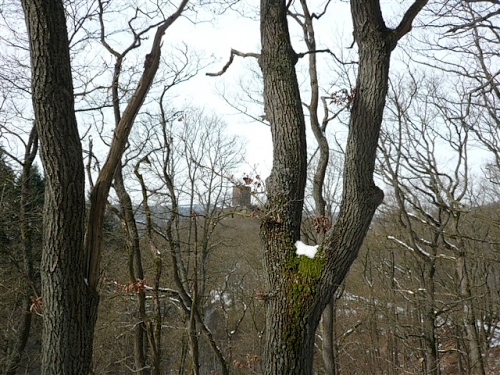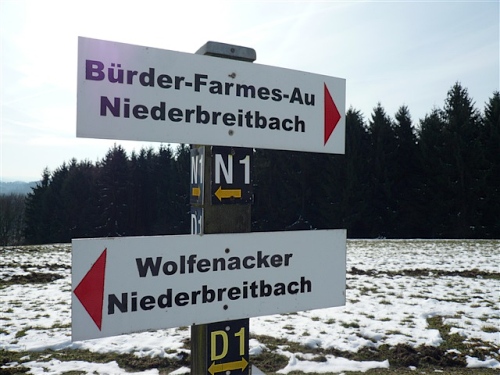 Flach führt uns der Weg weiter in Richtung Reifert. Der wolkenverhangene Himmel verbreitet mittlerweile Winterstimmung. Von den Tannenbäumen auf der linken Seite könnte ich mir ja schon mal einen als Christbaum aussuchen. Weihnachten ist ja nicht mehr weit. Da mir die passenden Gerätschaften fehlen, bleiben heute alle Bäume stehen. So geht es unverrichteter Dinge durch Reifert, ausnahmsweise mal wieder bergab. Ein Plausch mit Frank läßt mich meine müden Beine vergessen. Der Weg hinab ins Walbachtal lockert die Gelenke zusätzlich, am Ende erwartet uns, wiederum nach einem Aufstieg, Schloß Walburg. Von seinem Turm aus soll das uns entgangene Roßbacher Häubchen zu erblicken sein. Aber auch dieser Ausblick bleibt uns verwehrt, denn das Schloß befindet sich in Privatbesitz.