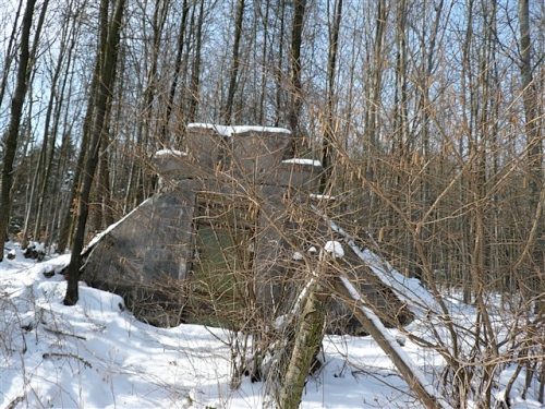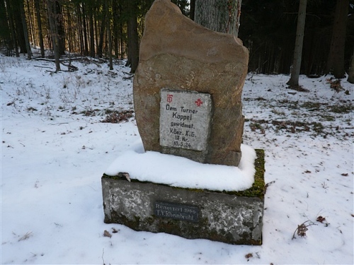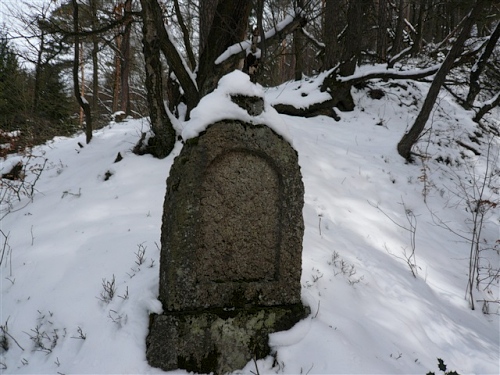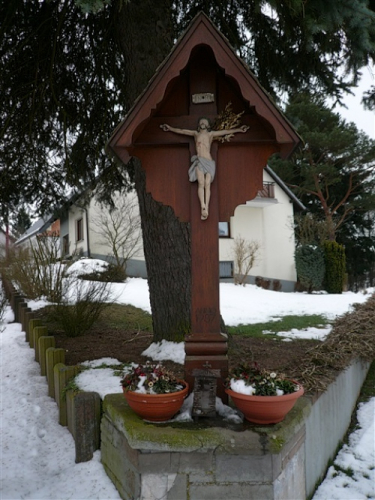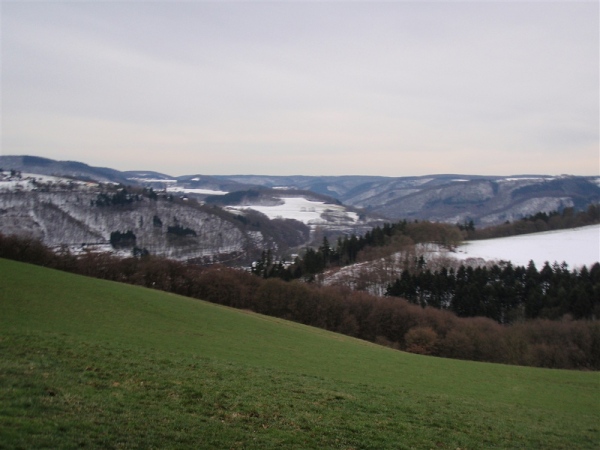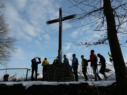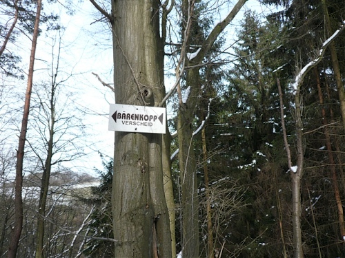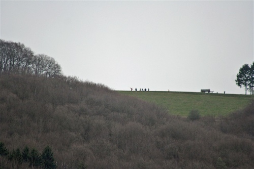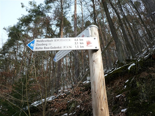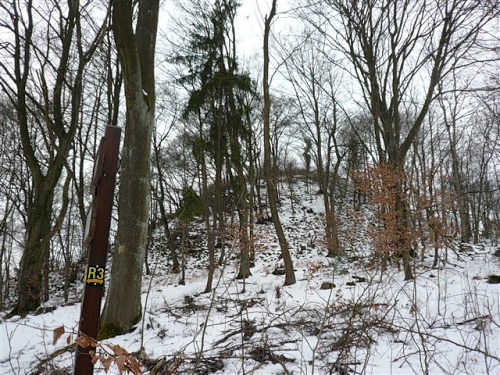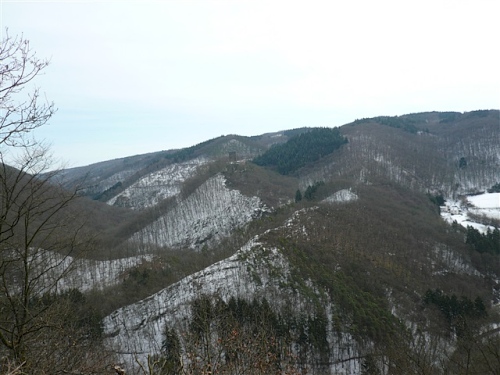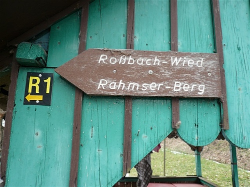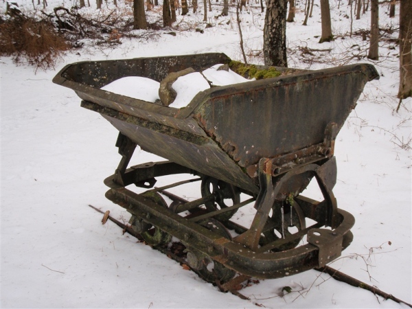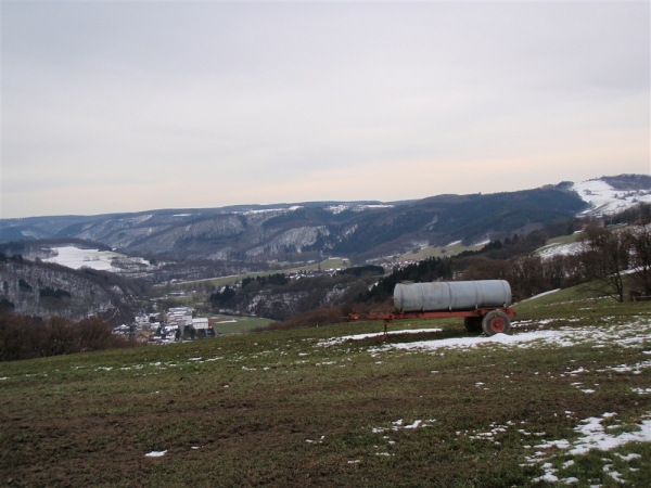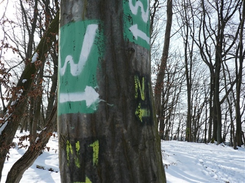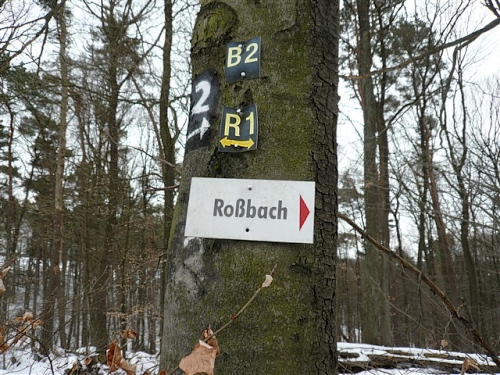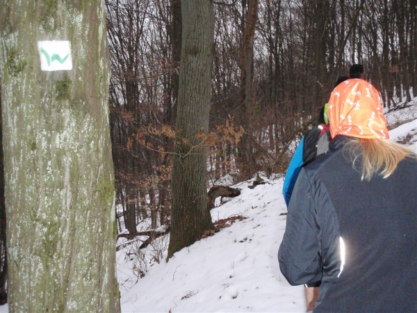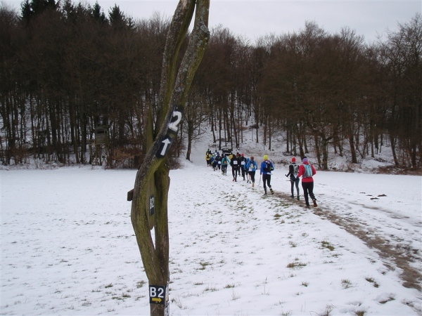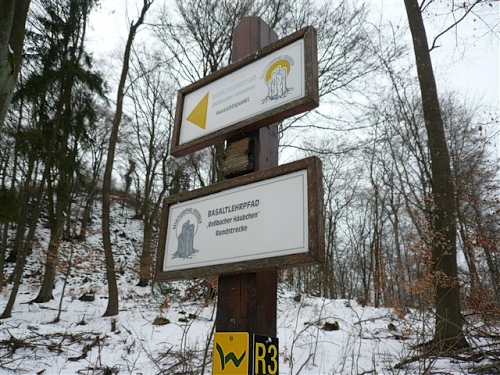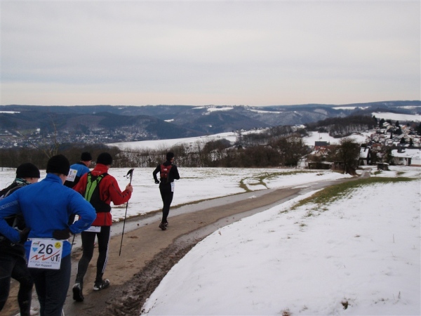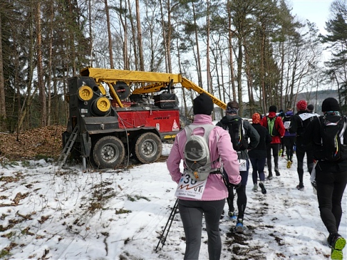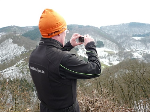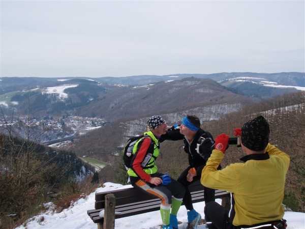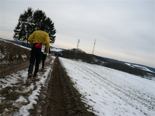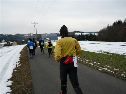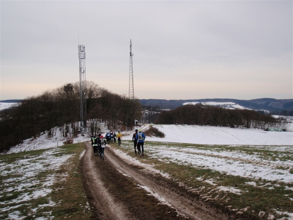 Manch einem fällt es jetzt schon etwas schwer, wieder in die Gänge zu kommen. Zugegeben, mir auch. Aber Wolfgang mit seiner Pfeiffe ist unerbittlich und gibt pünktlich das Signal zum Aufbruch. Der Weg führt jetzt leicht bergab in Richtung Breitscheid, da fällt das Laufen wieder leichter. Zudem ist bald die Marathonmarke erreicht. Für uns Sammler ein weiterer Haken auf der Liste, alles Weitere ist jetzt Zugabe unddas hebt die Stimmung. Die Aussicht auf die nächste Aussicht gibt weiteren Auftrieb. So geht es wieder locker durch Breitscheid in Richtung Roßbacher Häubchen. Für die Aussicht nehmen wir extra einen Abstecher in Kauf, nur um uns heute von Wolfgang erklären und zeigen zu lassen, daß ein Besteigen des Gipfels wegen des Schnees keinen Sinn macht. Na ja, wir wollten ja auch möglichst den gesamten Trail sehen und so fehlt uns wirklich nur das Häubchen. Eine Lore erinnert an den Basalttagebau, der hier einst, wie am Malberg, betrieben wurde.