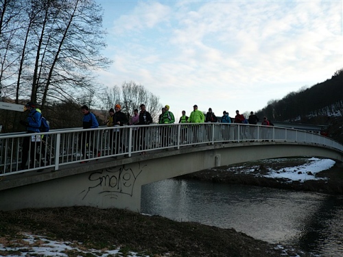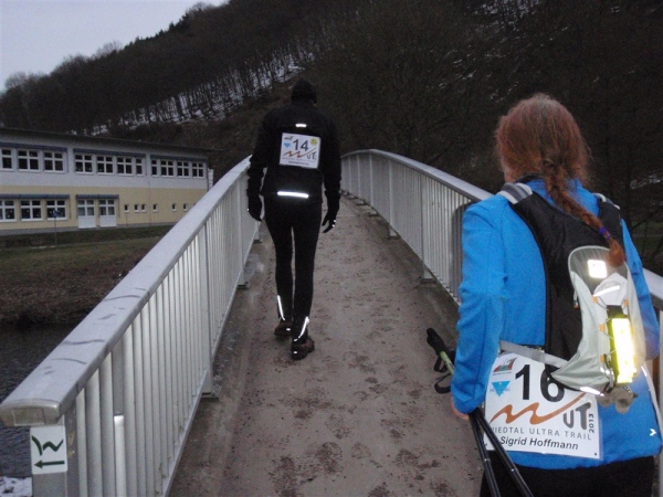 Am Ortseingang heißt es ein letztes Mal sammeln. Die letzten 1,5 KM führen uns an der Wied entlang. Wie wir den Lauf begonnen haben, werden wir ihn auch beenden, nämlich zusammen. Ein Blick über die Wied zeigt mir die vom Staffelmarathon bekannte Strecke hinter der Sporthalle. Tip: 3. Oktober, Einzelläufer herzlich willkommen. Nur mal so ganz nebenbei und unter uns: Ich bin dreifacher Finisher… Weit kann es nicht mehr sein und schon ist die Fußgängerbrücke erreicht, die uns ein letztes Mal über die Wied führt. Heute Morgen war sie noch sauber, jetzt trägt sie deutlich die Spuren des Laufes, die wir alle hinterlassen haben.
