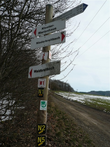 In jeder Hinsicht erleichtert machen wir uns alle wieder auf den Weg, um die letzten Höhen dieser Etappe zu erklimmen. Hinauf geht es Richtung Weißenfelser Ley. Ein weiterer Aussichtspunkt über dem Wiedtal, den wir heute allerdings nicht mehr erreichen, in den Lauf kann man halt nicht alles packen. Wir biegen vorher ab, um nach einer weiteren Wiedüberquerung uns wieder am wohlbekannten Verpflegungsangebot zu laben.