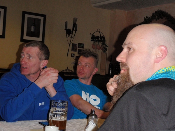 Um 19.00 Uhr finden wir uns im Hotel Zur Post ein, um ein herrliches Nudelbuffet zu verspeisen. Bevor es an die Ehrung der Beteiligten geht, sprechen wir diesem erstmal ordentlich zu. Unterhalten werden wir derweil durch eine Diashow mit Wolfgangs Bildern des Tages. Einige sind ohne ihre typische Laufkleidung kaum wiederzuerkennen. Mit den Startnummern war das einfacher, jeden zu identifizieren, da diese mit vollem Namen versehen waren.