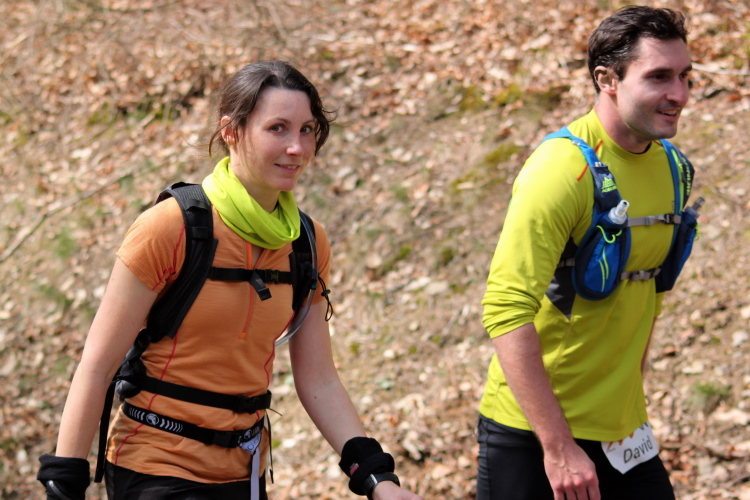 Nun haben wir eine sehr lange, moderate Bergab- und natürlich wieder Bergaufphase vor uns, nach denen wir hinter der Neschermühle meinen Lieblingstrail erreichen. Schmaler geht’s nicht, steinig ist er, ich liebe ihn. Von mir aus könnte er mehrere km lang sein. Überraschend ist für viele Teilnehmer der letzte km der vierten Etappe, denn der ist komplett neu. Geile, erst spät entdeckte Serpentinen ersetzen normalen Waldweg, tief unter uns liegt die Wied unter schräger Wand. Aufpassen, daß man nicht abstürzt! Dann sind 53 km geschafft, letzter VP, wieder das volle Programm. Hanne kannte den Abschnitt nicht. „Wolfgang, warum bist Du da lang?“ Ganz einfach, weil's schön ist. Das überzeugt, alle lachen. Nochmal tief Luft holen, die alten Hasen wissen, was jetzt droht. Auch dem Jürgen, der nicht aufhören will. Ich schüttele nur noch den Kopf.