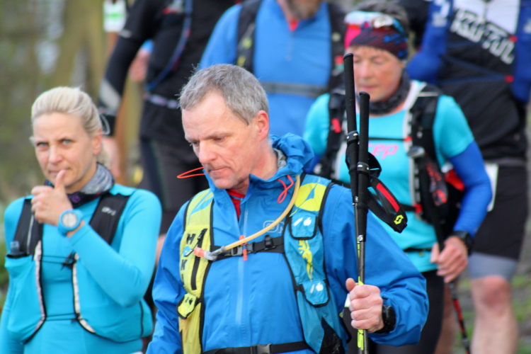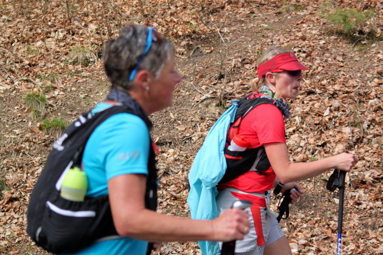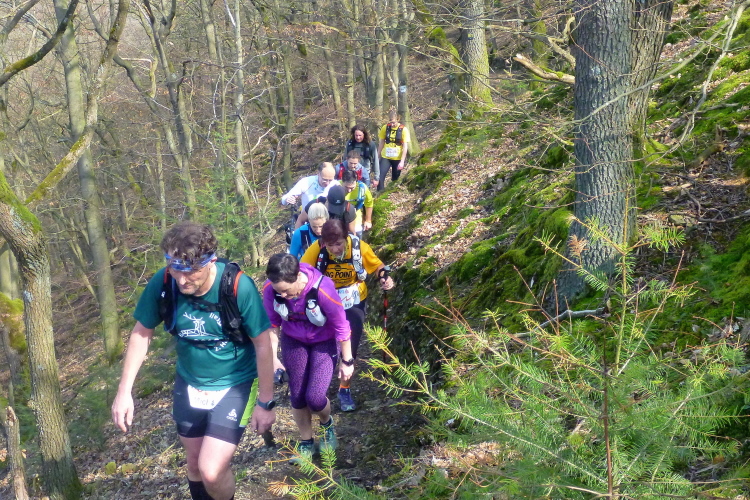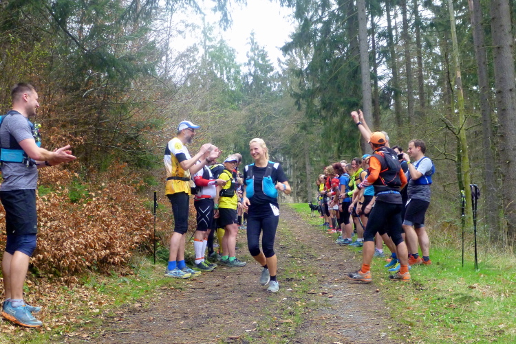 Hollig ist unser nächstes Zwischenziel, durch den Wald zieht sich die Gruppe doch stärker als gewollt auseinander, ein paar schwächeln schon merklich. Nun, vorgewarnt hatten wir, jeder sollte aktuell in der Lage sein, einen flachen Marathon im Sechserschnitt laufen zu können. Gruppenlauf, 65 km, das packen wir schon, dachten alle, aber einigen wenigen werden die vielen Höhenmeter doch vorzeitig zum Verhängnis. Am Ortsausgang von Hochscheid sind wir wieder im Wald und nach 41,5 km am dritten VP beim Sportplatz Nassen. Zum zweiten Mal bereits sind die gekochten Kartoffeln der Renner, auch das frische Brot mit Käse geht hervorragend. Neben den vielen übrigen Sachen. Negative Kalorienbilanz? Na ja...