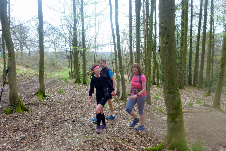 Nach zwei weiteren km haben wir das Kloster erreicht, gute 27 km sind geschafft, einige auch. Essen, Trinken, Pipi, weiter. Auch Jürgen, der sich mal eben von 20 km flach auf 27,5 km mit tausend HM gesteigert hat. Nach 30 km sind wir an den historischen drei Weihern der Deutschherren, welche lange das Land beherrschten. Quer durchs Waldbreitbacher Oberdorf sind wir bald wieder auf schmalem Weg im Wald. Als dann jeder am Judenfriedhof, mitten im Wald, die traurige Geschichte eines kleinen Teils der früheren Bevölkerung erfahren hat, geht es wieder hoch, runter, und dann über den Hochscheider Seifen richtig hoch. Au Backe, heftig. Dafür ein erneuter Hammerblick am Bärenkopp mit Gipfelkreuz auf Waldbreitbach. Aber nicht zu lange, viel Weg liegt noch vor uns.