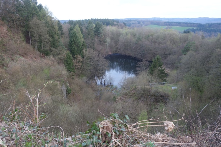 Die letzten sind an der Hütte und Wolfgang schreitet voran. Rechts von uns liegt der Malbergsee. Früher wurde hier Basalt abgebaut. Eine Hinweistafel gibt Informationen zur Geschichte des Malbergs und ein Basaltlehrpfad bietet Informationen zum Basaltabbau am Malberg.