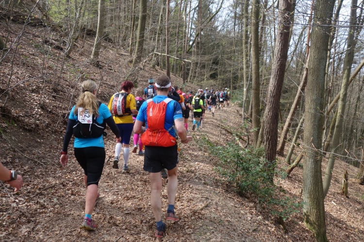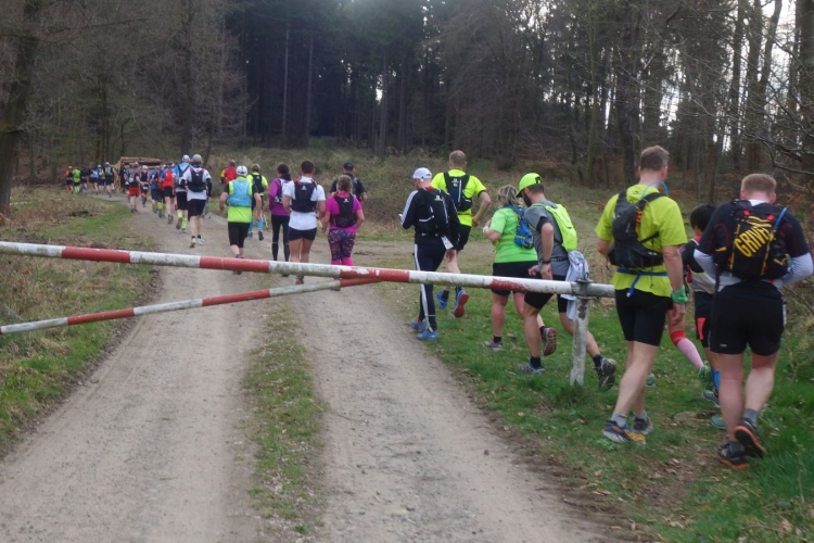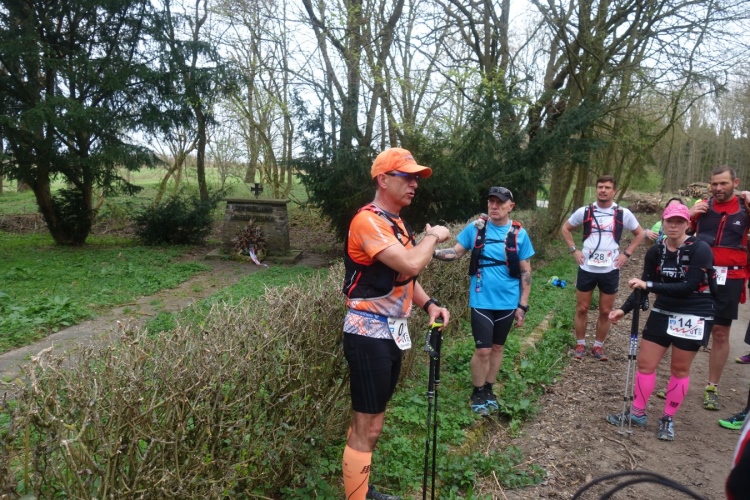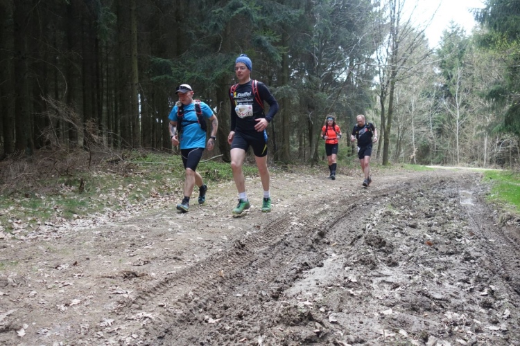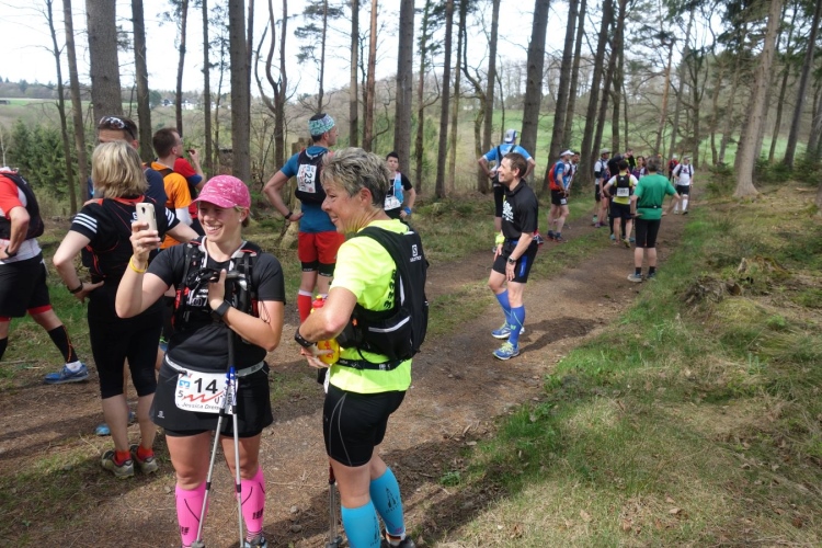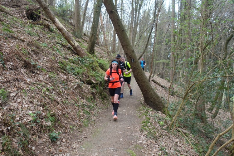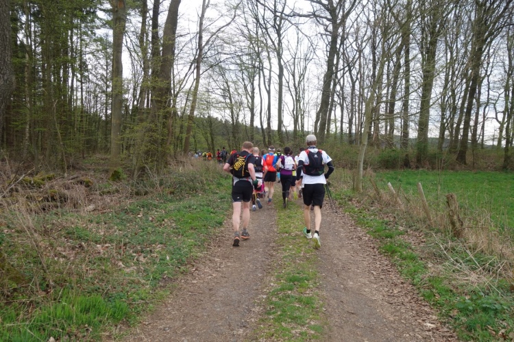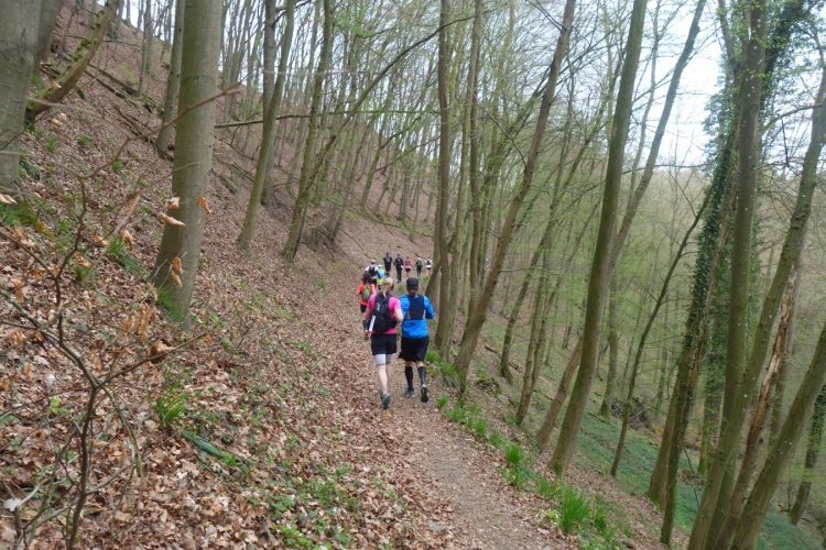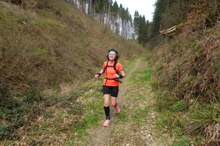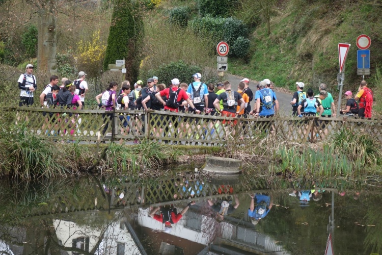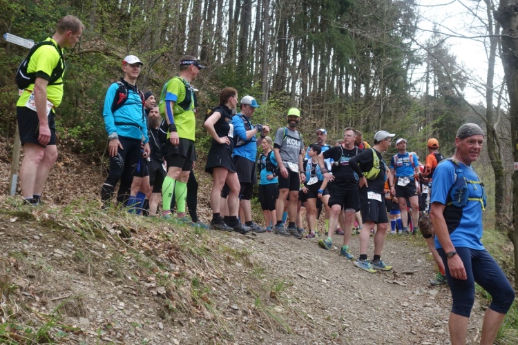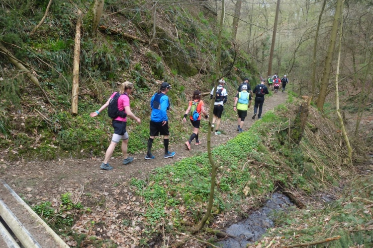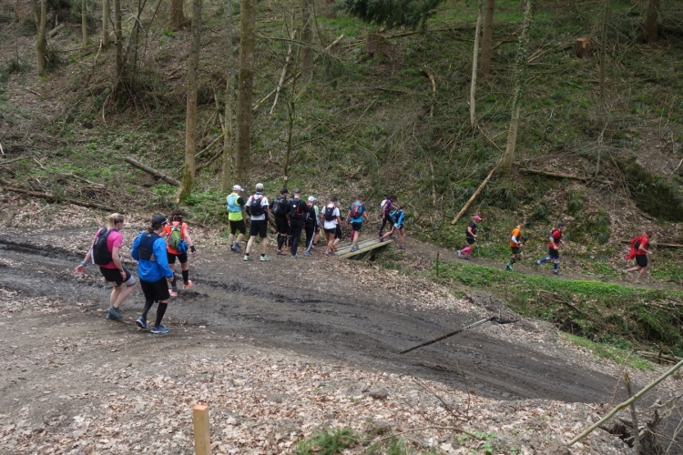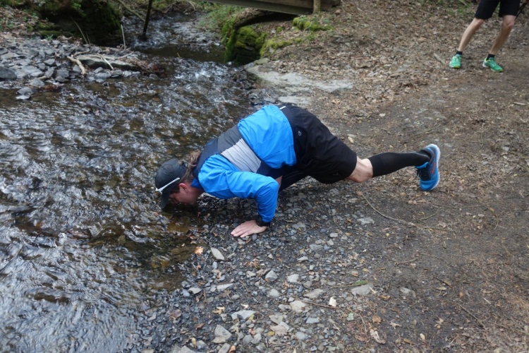 Im Wald muss eine kurze Pause eingelegt werden. Während Hannelores Blase am Fuß versorgt wird nutzen einige Läufer die Zwangspause und hocken sich nieder. Weiter geht’s. Ein kleiner Bach wird gequert und es wird etwas schlammig für ein kurzes Stück.