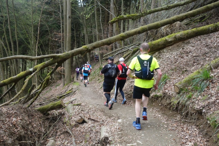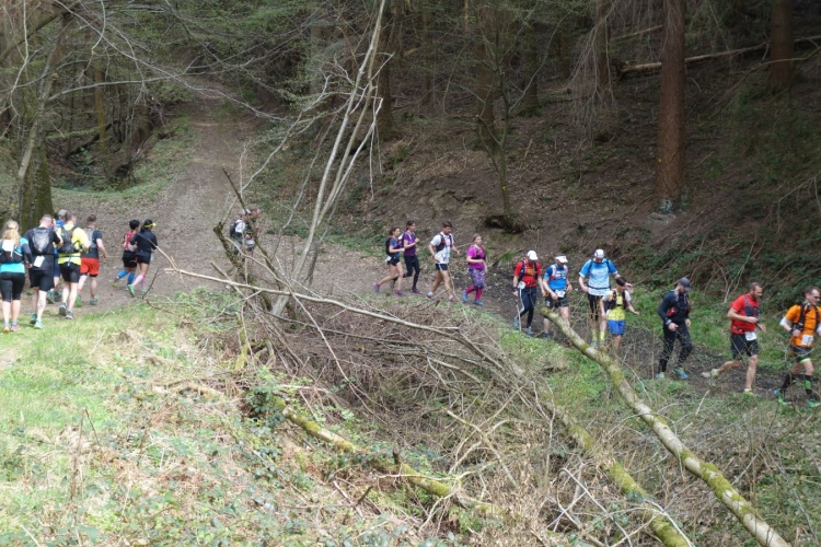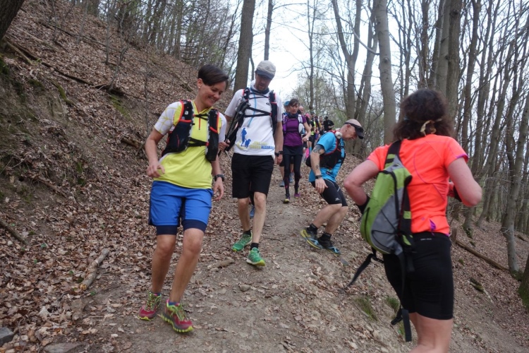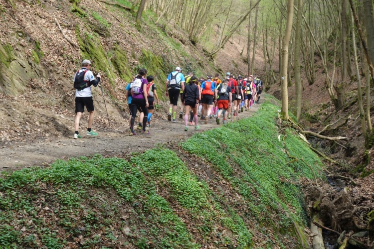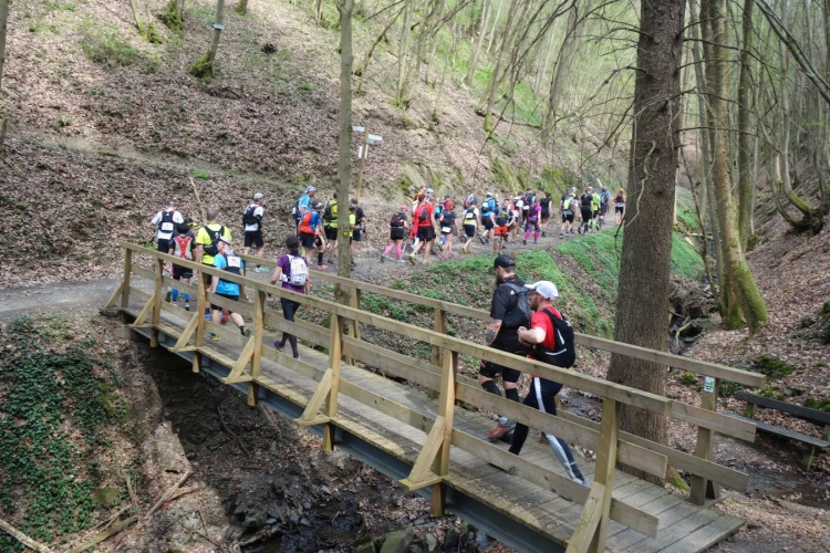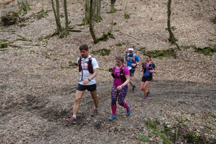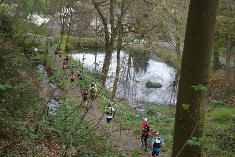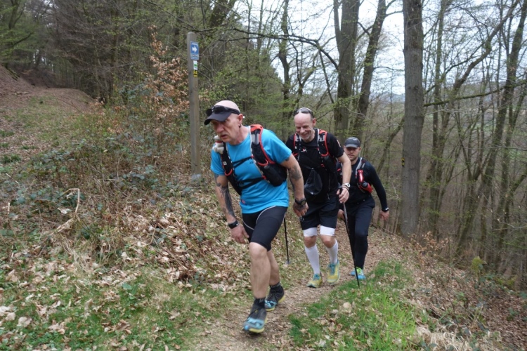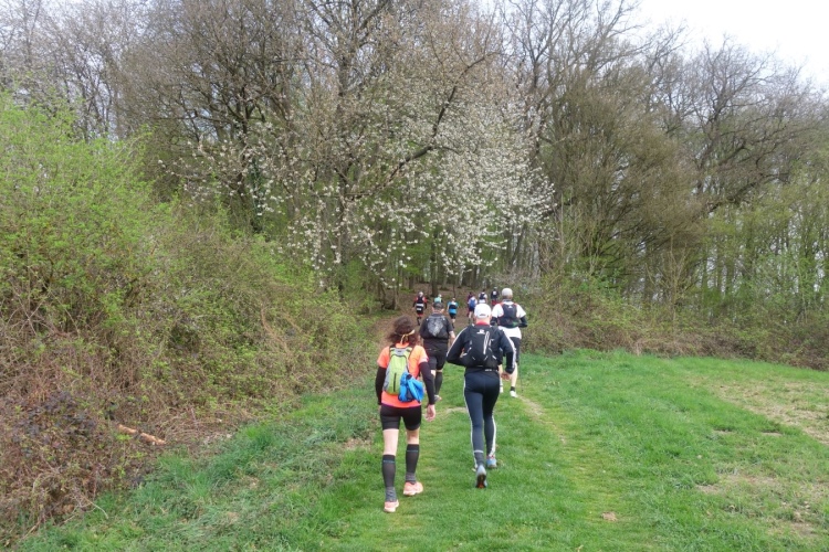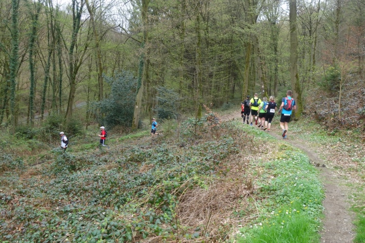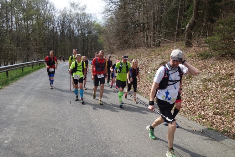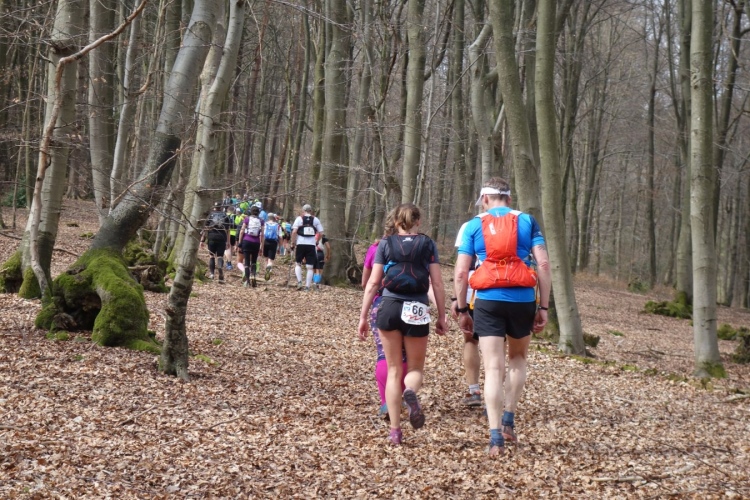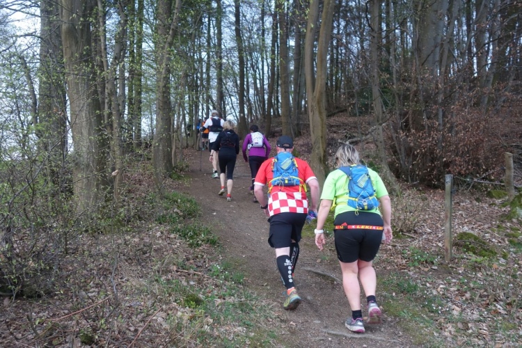 Im Wald muss eine kurze Pause eingelegt werden. Während Hannelores Blase am Fuß versorgt wird nutzen einige Läufer die Zwangspause und hocken sich nieder. Weiter geht’s. Ein kleiner Bach wird gequert und es wird etwas schlammig für ein kurzes Stück.
