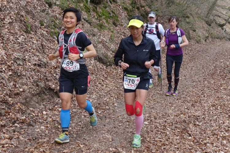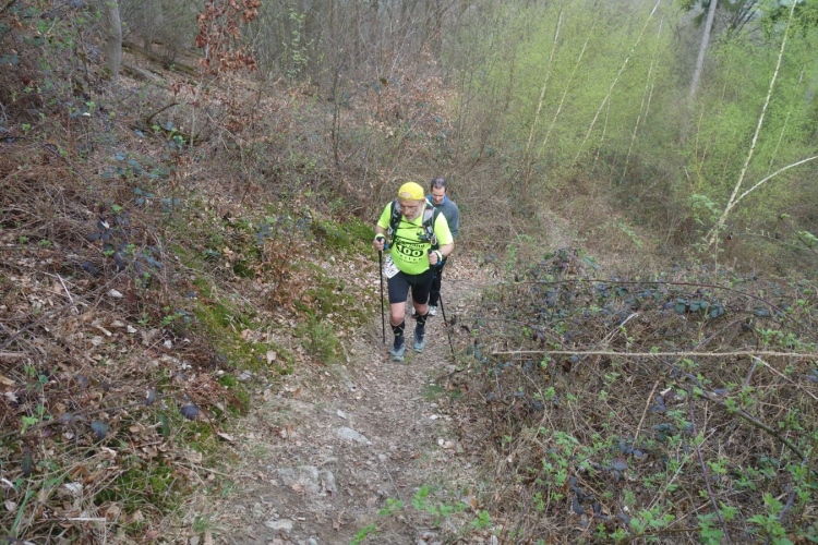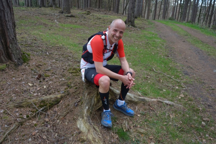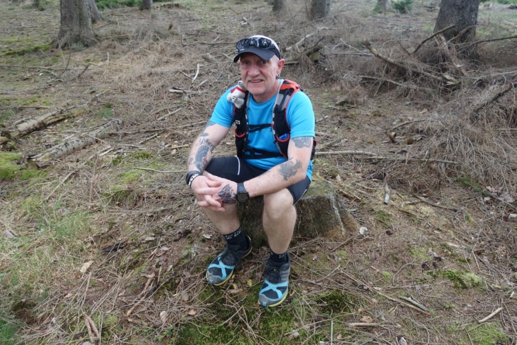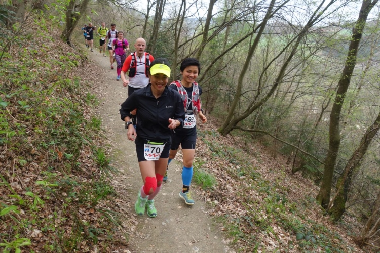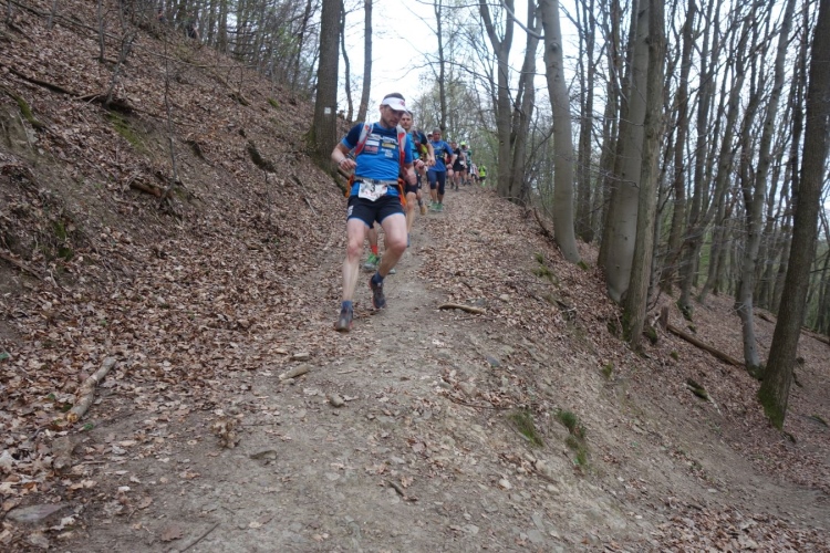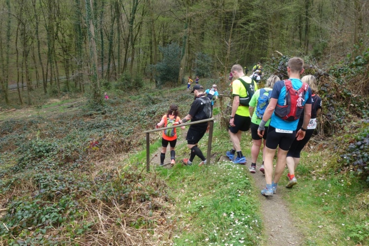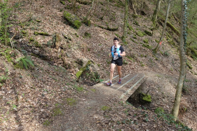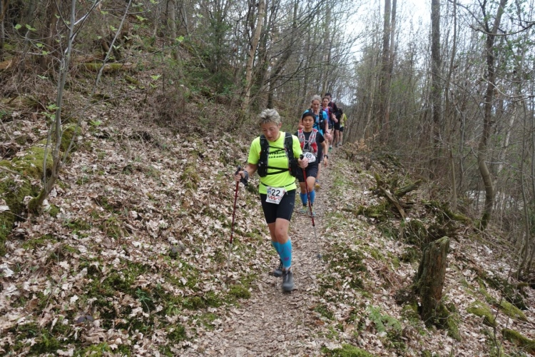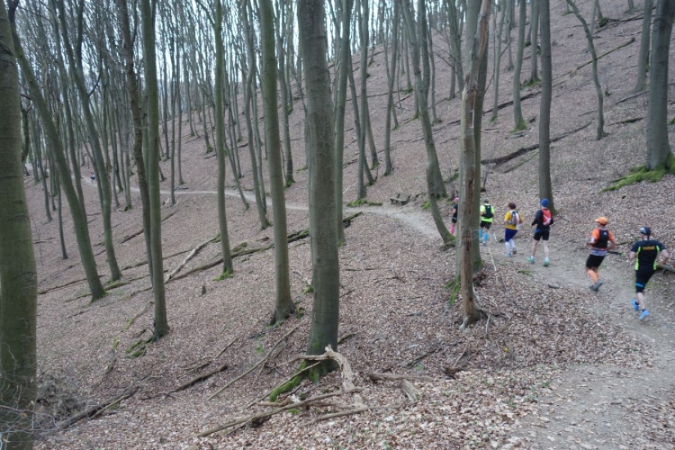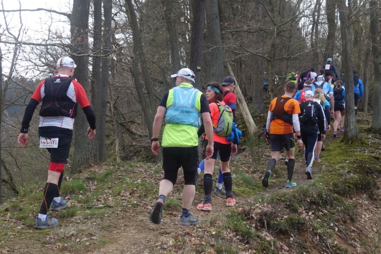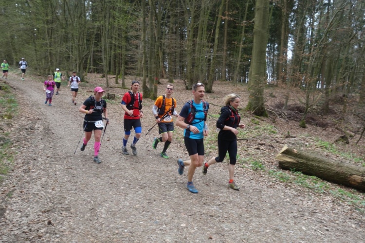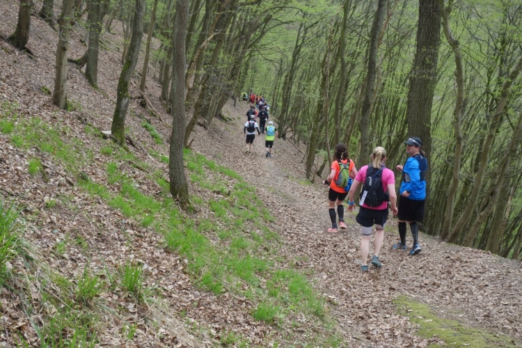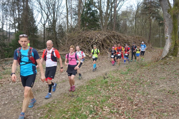 Im Wald muss eine kurze Pause eingelegt werden. Während Hannelores Blase am Fuß versorgt wird nutzen einige Läufer die Zwangspause und hocken sich nieder. Weiter geht’s. Ein kleiner Bach wird gequert und es wird etwas schlammig für ein kurzes Stück.