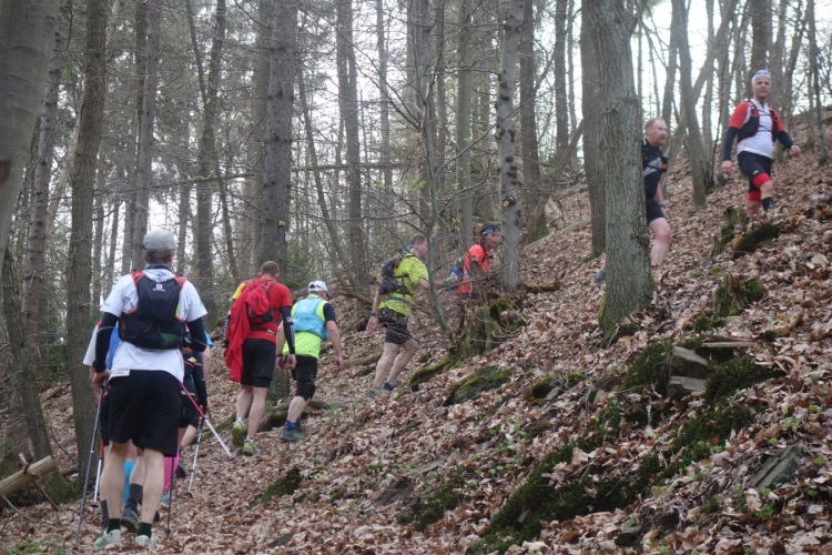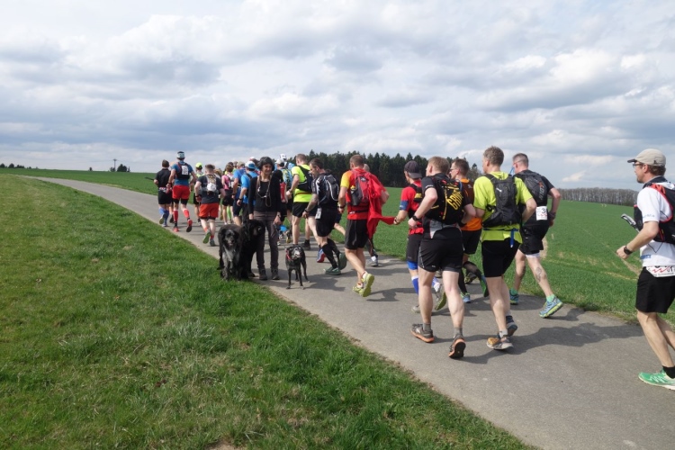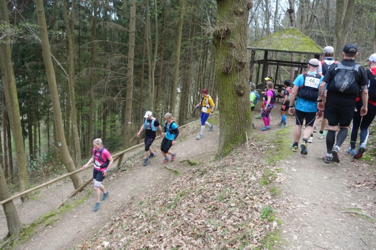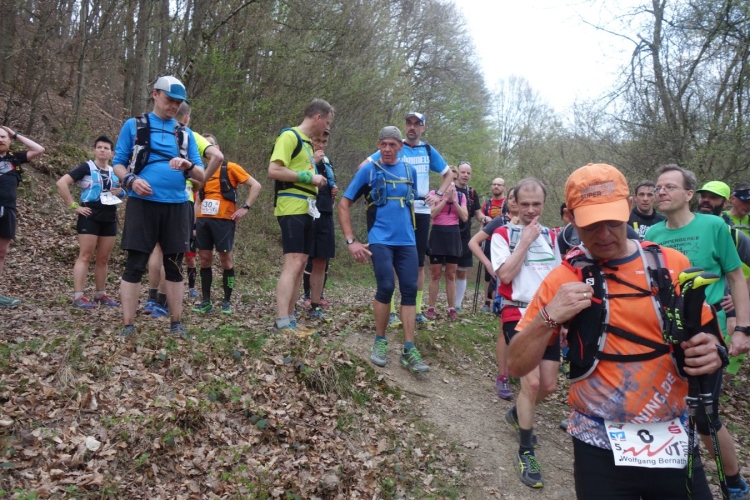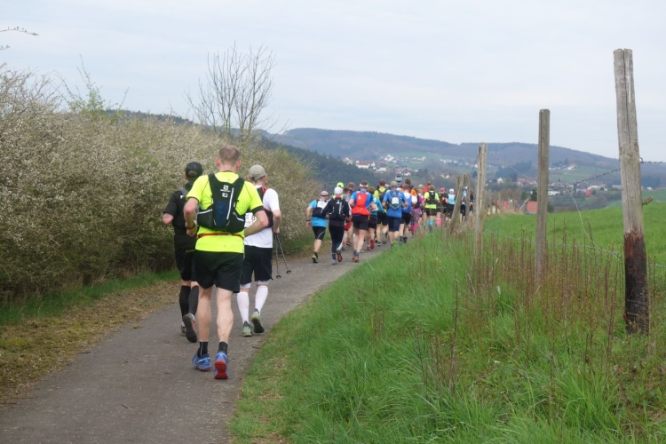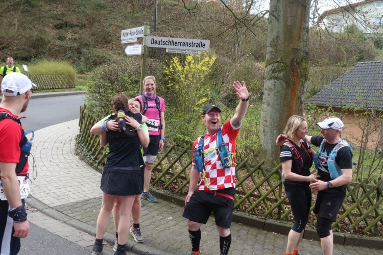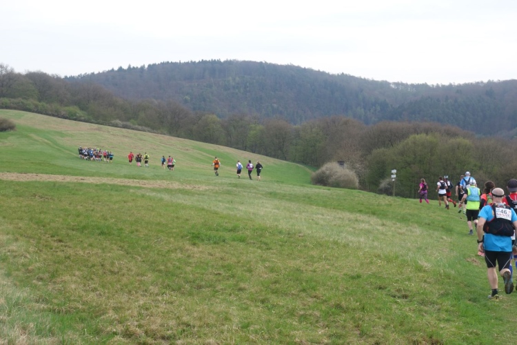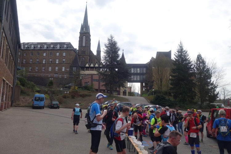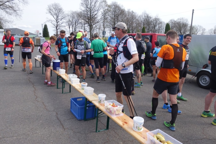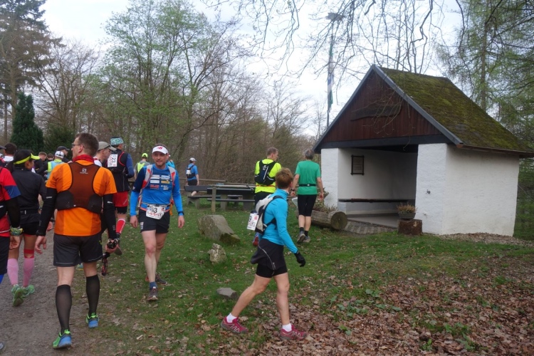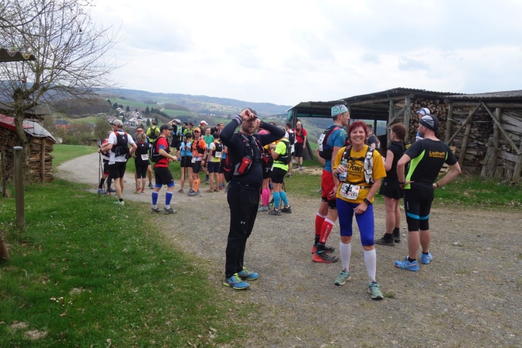 Über weite Wiesenflächen laufen wir auf der Höhe dem zweiten VP am Kloster Marienhaus entgegen. Hier haben Elke, Josef und weitere freundliche Helfer wieder ein kleines kulinarisches Paradies für uns aufgebaut. Der Renner sind die gekochten Kartoffel. In Salz eingetunkt kann nicht nur ich nicht genug davon bekommen. Alle greifen zu und freuen sich über die Pause. Ich nutze diese um meinen Rücken zu dehnen. Der fängt wieder an mir Schmerzen zu bereiten. Aber aussteigen ist nicht. Ich laufe durch. Den Spaß heute will ich mir durch den Rücken nicht verderben lassen.