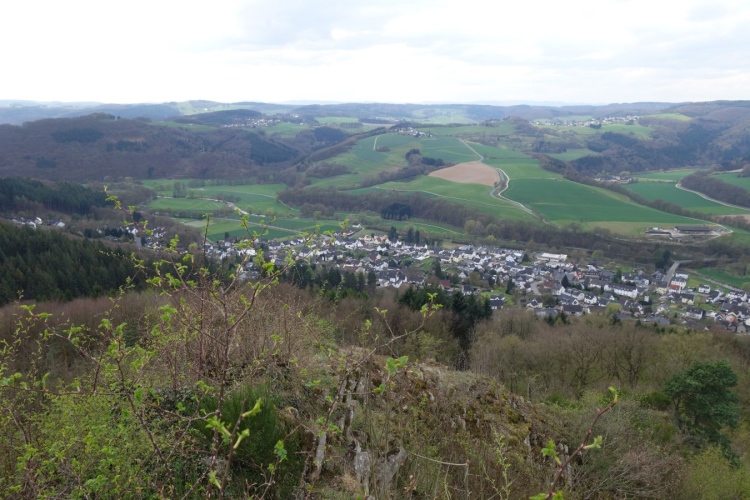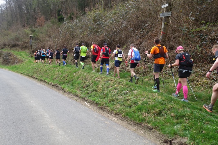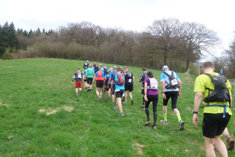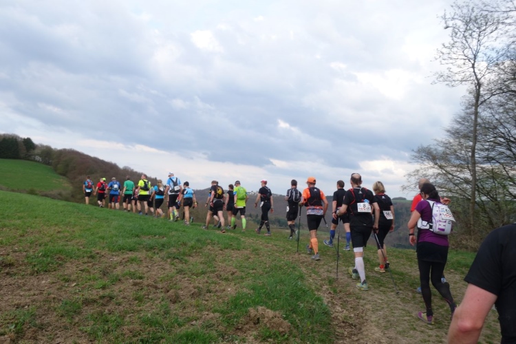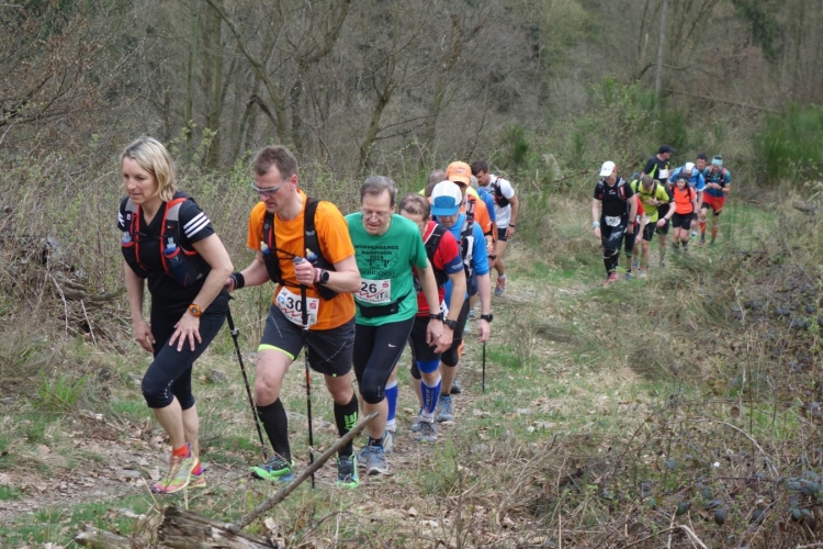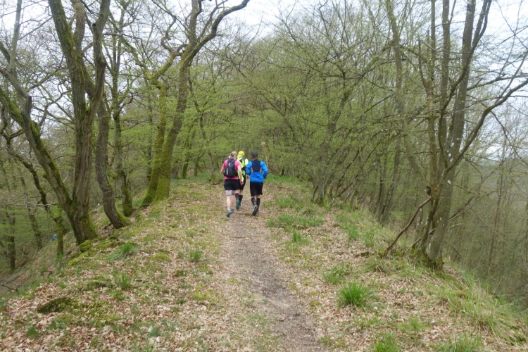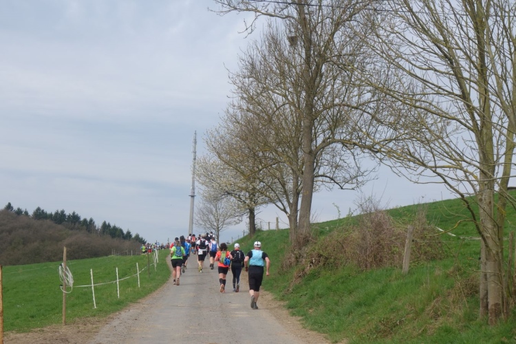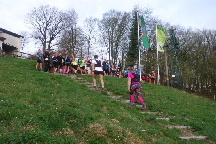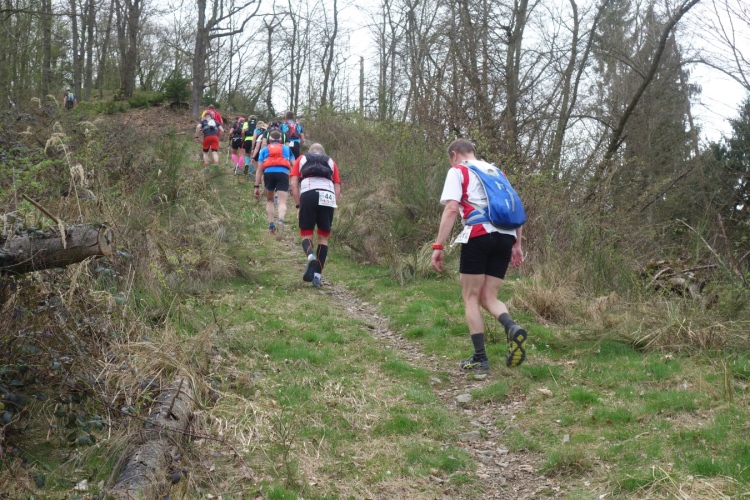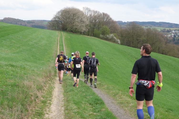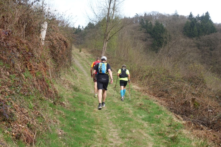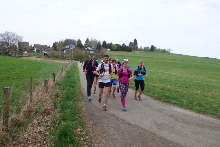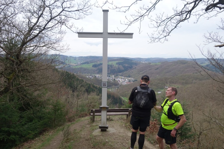 Endlich ist er geschafft der Bärenkopp. Bären gibt es hier oben nicht, dafür aber einen grandiosen Blick in die Landschaft. Wir verlassen den Wald und kommen an die K 90. Über wenige hundert Meter Straße laufen wir nach Verscheid. Direkt hinter dem kleinen Ort biegen wir erneut rechts ab in den Wald. Obwohl mein Rücken mehr und mehr zwackt bin ich von der abwechselnden Strecke unverändert total angetan. So ergeht es auch de anderen Läufern.