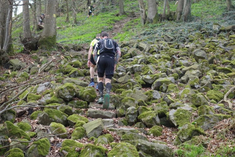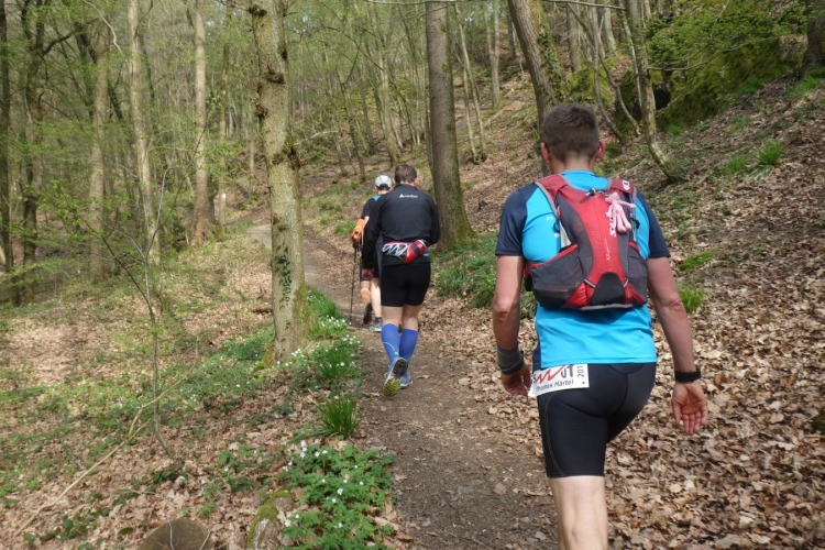 Bald verlassen wir wieder die Straße und laufen rechts ab hoch in den Wald. Ein schöner steiniger Pfad nimmt uns auf. Wir queren die kleine Straße die vorbei an der Gedenkkapelle entlang des Fockenbach führt und laufen weiter im Fockenbachtal. Die Sonne ist mittlerweile heraus gekommen und nicht nur mir wird es warm. Es ist einfach nur schon so durch das von Buchenwälder dominierte Fockenbachtal zu laufen.