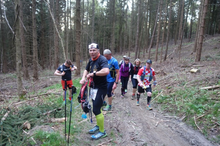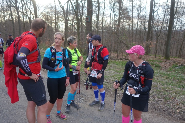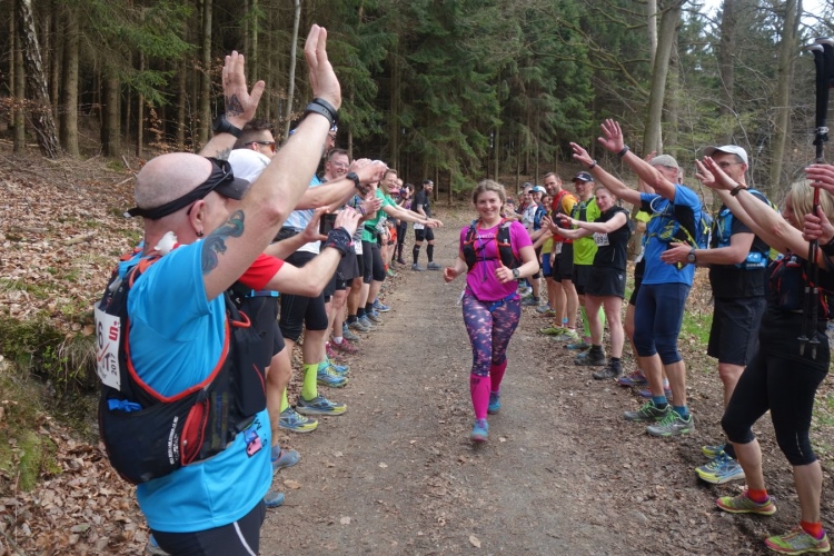 Der VP wird heiß herbei gesehnt. Ich stärke mich u. a. mit leckeren Kartoffeln. Aber da ruft Wolfgang auch schon zur vierten Etappe. Es geht über 11,5 Km Auf und Ab. Im Wald stoppt Wolfgang und läßt uns zwei Reihen bilden. Ist jetzt Spießrutenlaufen angesagt? Keine Bange, es steht eine Ultrataufe an. Tanja absolviert heute ihren ersten Ultralauf und wird daher von den anderen Läufern frenetisch bejubelt.