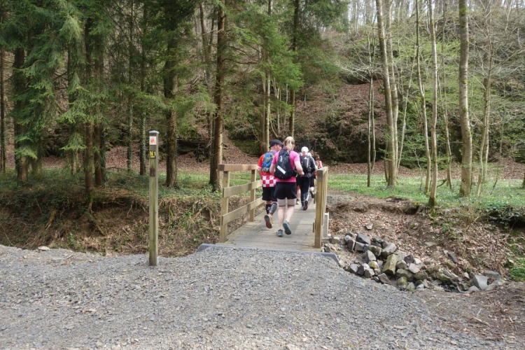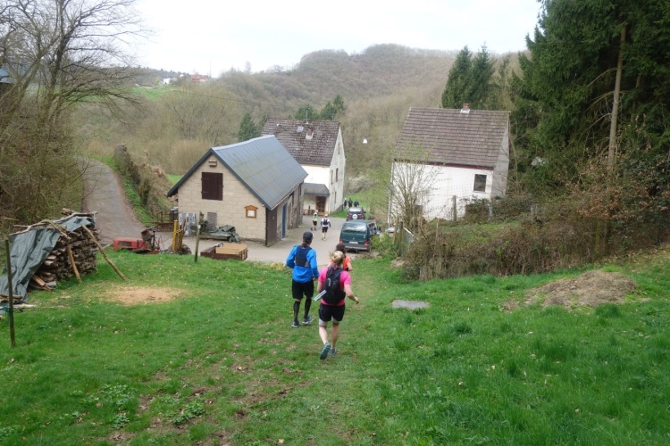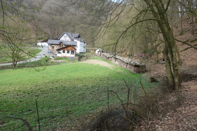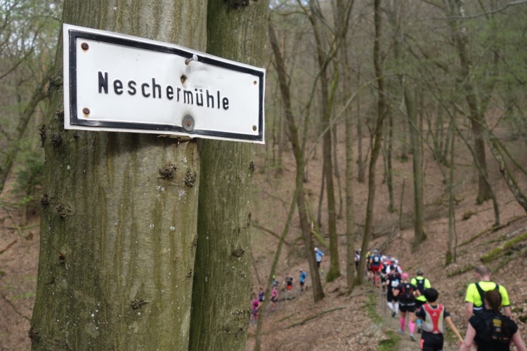 Wir laufen zur Nescher Mühle durch den Wald. Hier wird für einen Moment gerastet. Nachdem das Feld wieder zusammen ist laufen wir auf der Straße parallel zum Masbach. Aber nur ein kurzes Stück. Dann heißt es rechts abbiegen und steigen. Ein wunderschöner Weg führt uns hinauf. Aber ebenso schön geht es dann hinab.