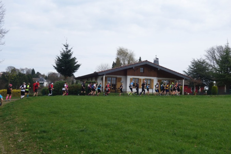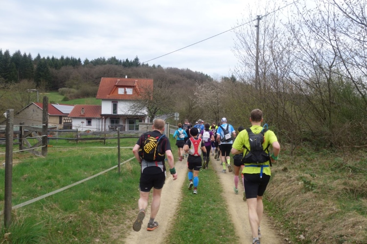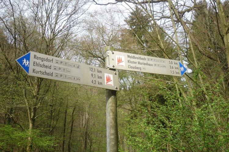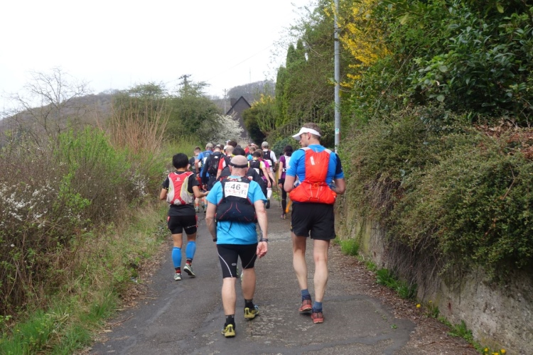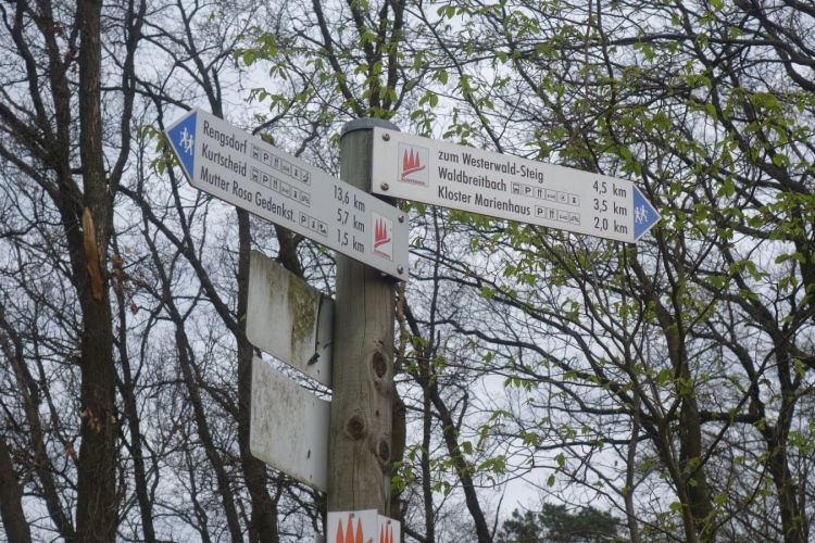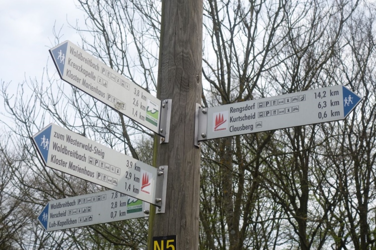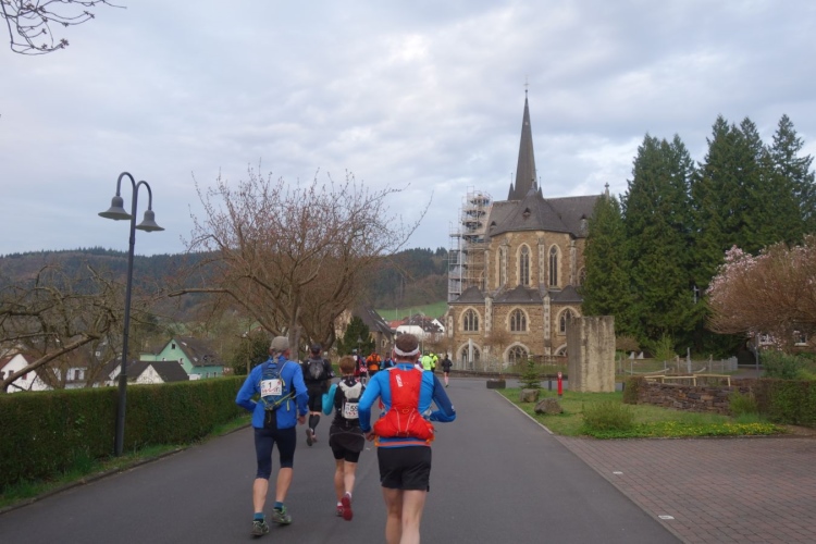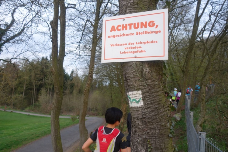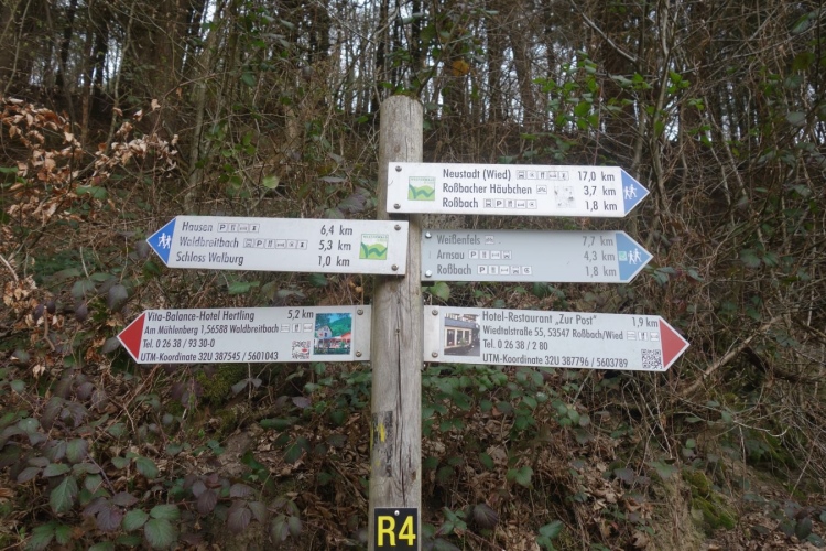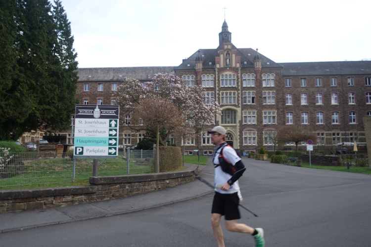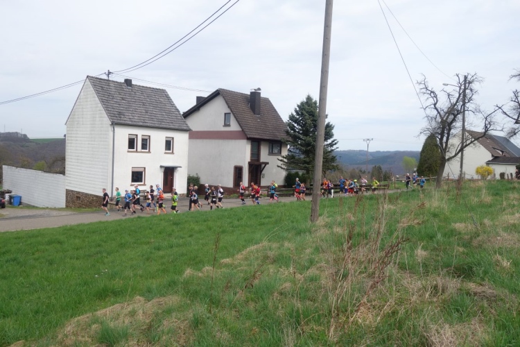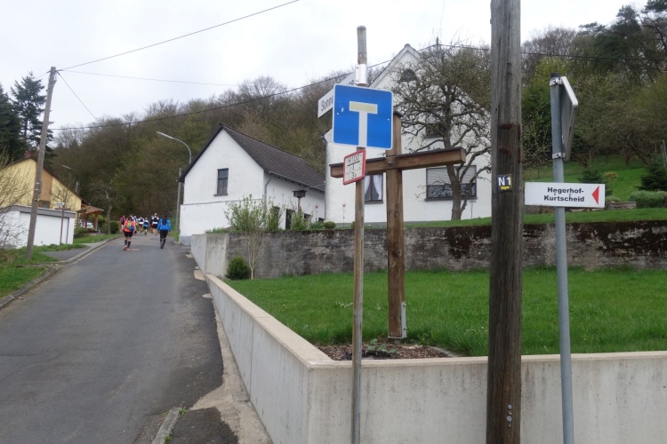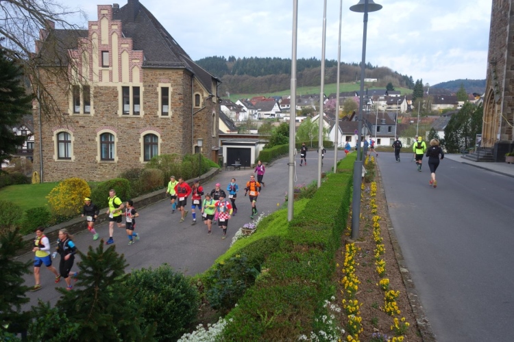 Wir laufen am Schulzentrum vorbei (Zieleinlauf/Wechselzone Staffelmarathon) zur Wied. Über eine Brücke geht es über den Fluß und schon wartet der erste Anstieg auf uns. Ein schöner Singlepfad läßt uns erahnen was uns heute erwartet. Rasch sind wir im Nachbarort Hausen. Hier startet der Malberglauf und wir stoßen im Ort auf die Strecke des Malberglaufes.