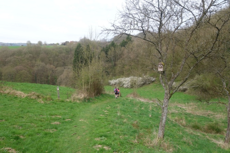 Wir verlassen den Wald und laufen über Wiesen auf der Höhe Richtung Wolfenacker. In dem kleinen Ort biegen wir links ab in die Sonnenstraße. Ob sich die Namensgeberin der Straße heute noch blicken läßt? Es ist angenehm temperiert, nicht zu kalt, nicht zu warm, geradeso recht zum Laufen. Aber es ist bewölkt. Ein wenig Sonne könnte nicht schaden. Aber immerhin, entgegen der Wettervorhersage ist es trocken. Das wird auch den ganzen Tag so bleiben. Gut so.
