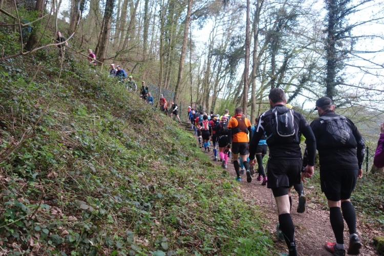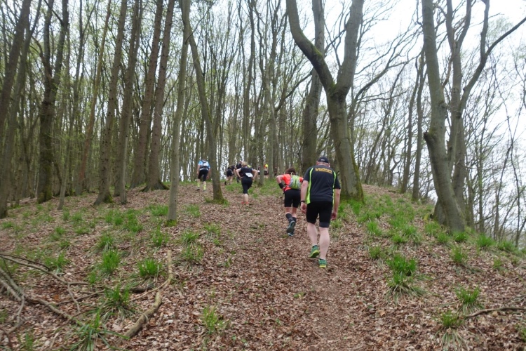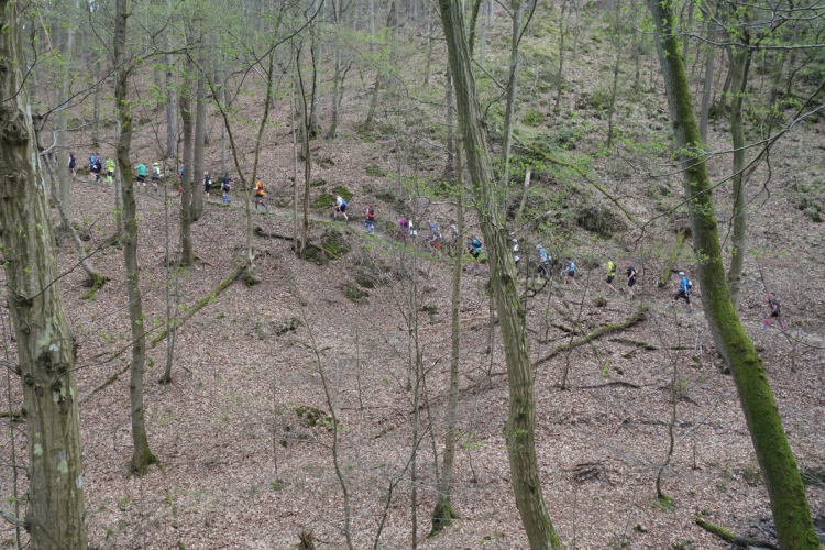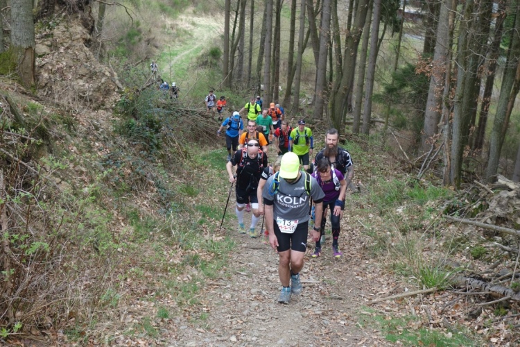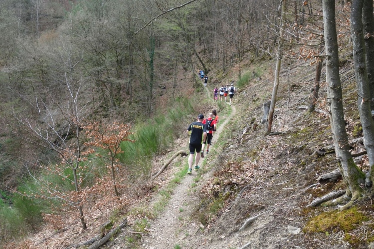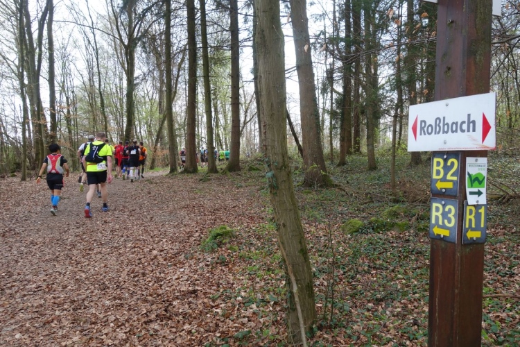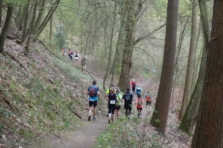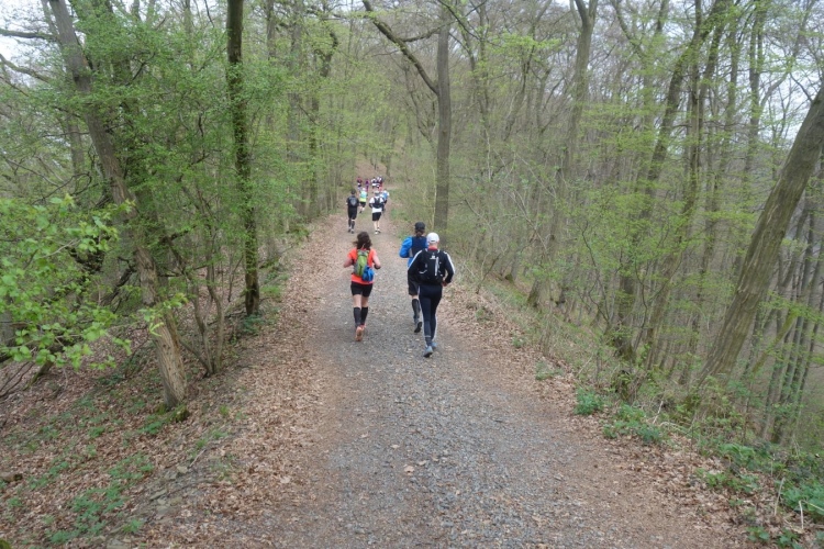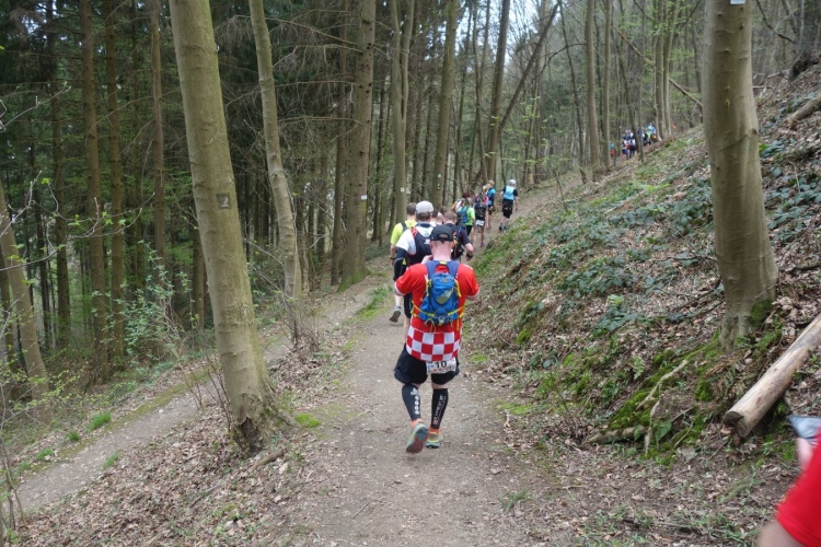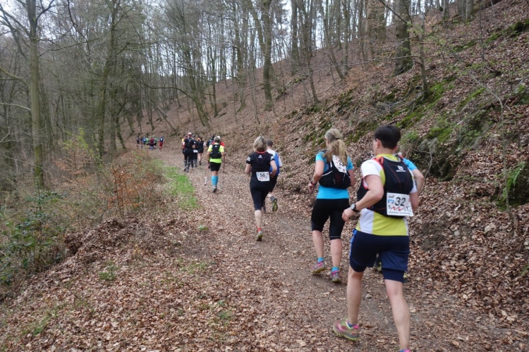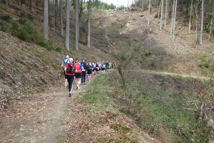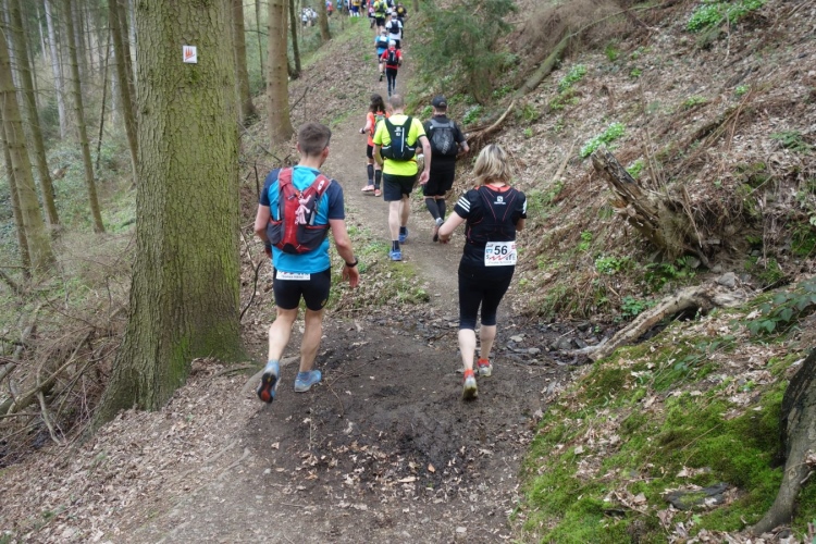 Sofort stürmen alle los, na ja, fast alle. Einige sausen hinunter wie von der Tarantel gestochen, andere lassen es gemütlich angehen. Egal wie gelaufen wird, es ist richtig schön hier hinab und nach dem Steilstück weiter durch den Wald bis an die Straße hinein nach Waldbreitbach zu laufen. Herrlich, ein richtiges Schmankerl fast zum Ende.