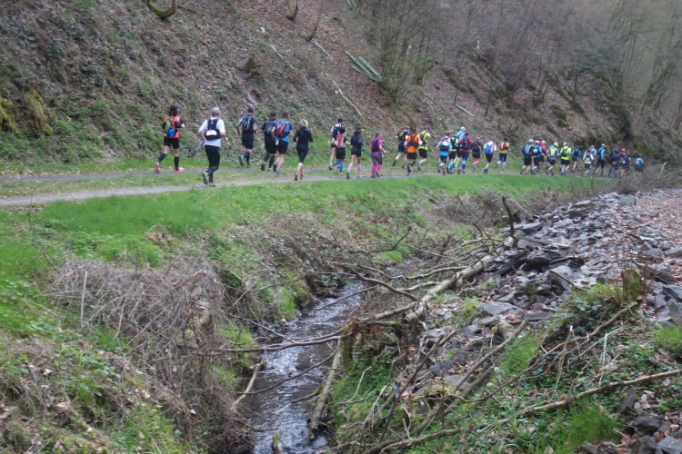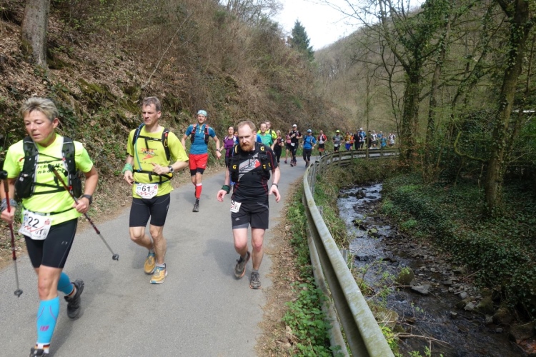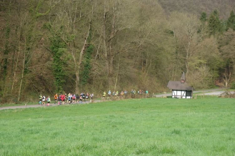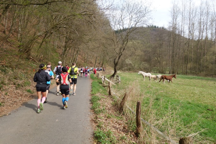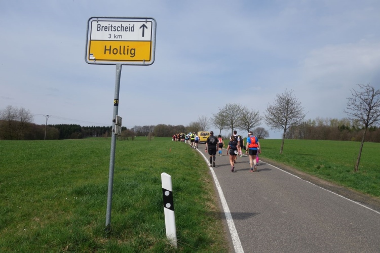 Kurz hinter der Fockenbachmühle wartet Wolfgang mit allen Läufern auf uns und wir sind wieder im Läuferfeld. Schade denke ich mir. Ich wäre gerne noch ein Stück des Weges weiter mit Hannelore alleine gelaufen. Wir laufen ein Stück aus Asphalt das Fockenbachtal hinauf und verlassen dieses und folgen dem Dasbach. Vor dem Weiler Hollig folgen wir ein kurzes Stück der K 88 und biegen nach links ab in die K 90. Vor Hochscheid laufen wir wieder in den Wald dem dritten VP in Nassen entgegen.