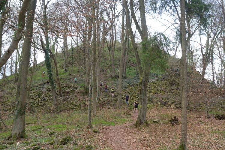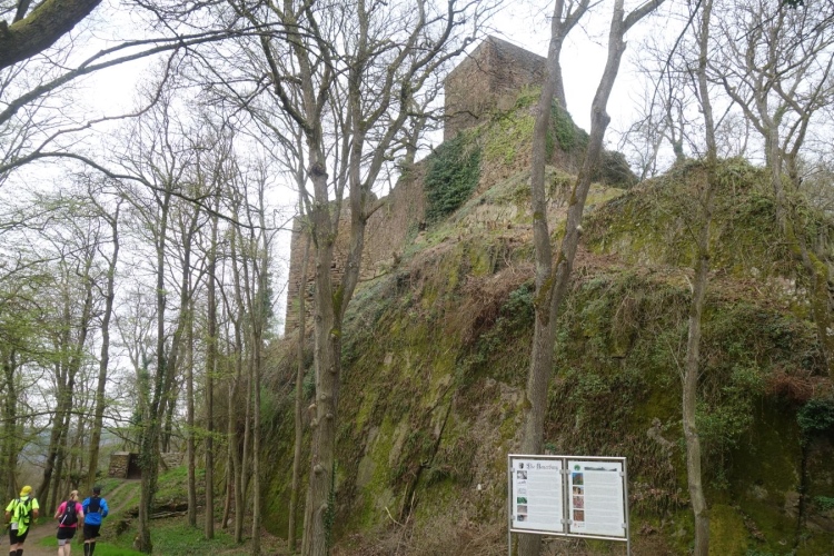 Vor einem steilen schmalen Abzweig abwärts macht Wolfgang kurz Halt. Wir dürfen den steilen Pfad jeder für sich abwärts rasen. Gesagt, getan. Eine wilde Hatz führt uns abwärts. Die Ruine der Höhenburg Neuerburg liegt vor. Erbaut wurde sie 1170 von Ludwig II von Thüringen, einem Schwager Friedrich Barbarossas. Links von der Burgruine laufen wir hinab und queren den Burgseifen, einen Nebenbach des Fockenbachs.